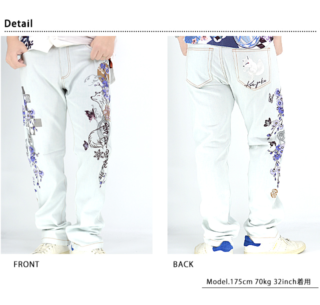 愛らしい狐のキャラクターが主役の【今昔】から「雪月風花」総刺繍ジーンズ(KJ-29218)のご紹介です。 今回は定番のインディゴデニムに加えて、新たに淡い色使いのデニムパンツをラインナップ。 季節ごとの自然の美しい風景という意味を持つ雪月風花(せつげつふうか)という言葉をテーマにしたデザインです。 フロントはジッパーフライ。 | |||||||||||||||||||||||||||||||||||