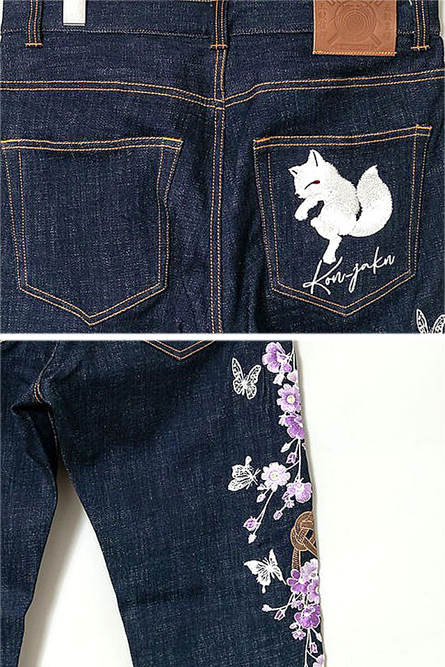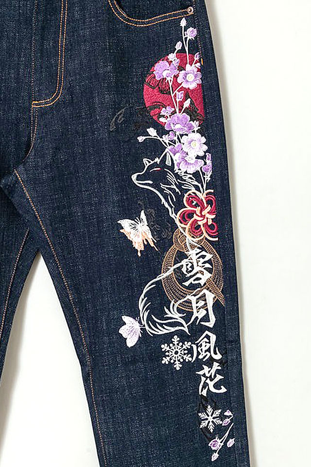 「雪月風花」総刺繍ジーンズ 今昔 KJ-29218 和柄 和風 デニム 狐 キツネ きつね こんじゃく