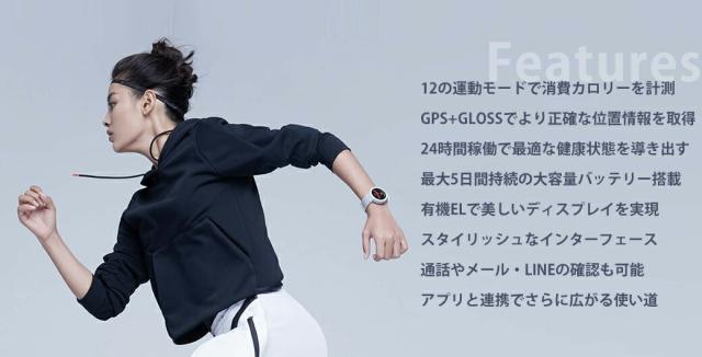 【画面】1.30 、インチAMOLED 解像度360x360、Corning Gorilla 3強化、ガラス+指紋防止コーティング時計