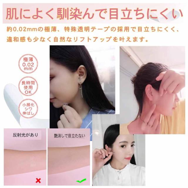 - 薄くて目立たないと思います。ほうれい線を引き上げたい私には上手く持ち上げて貼ることができず、髪の毛がじゃまになる感じでした。