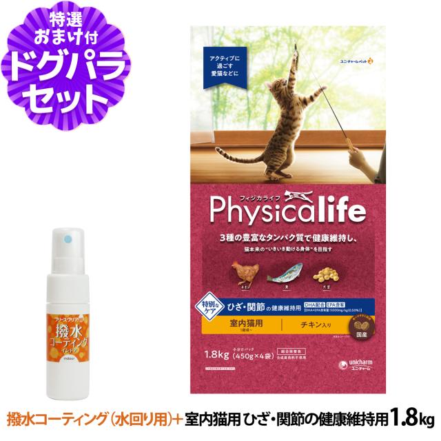 【順次パッケージ変更】フィジカライフ Physicalife 室内猫用 ひざ関節の健康維持用 1.8kg+撥水コーティングインドア(水回り用) 20ml