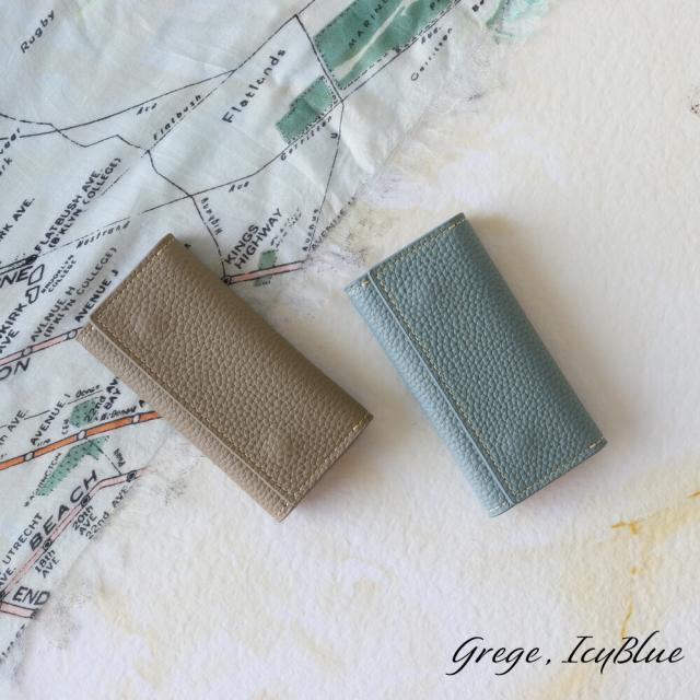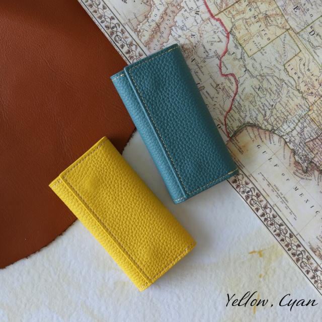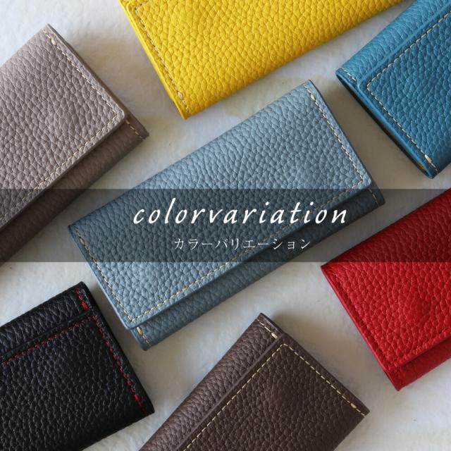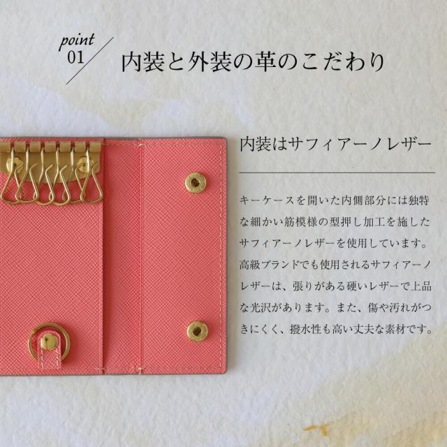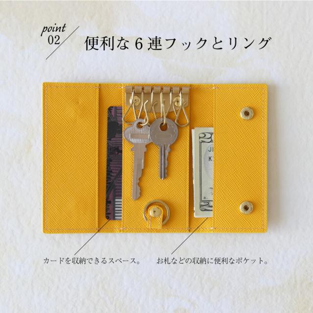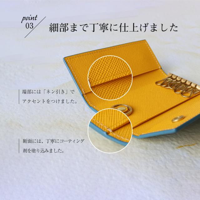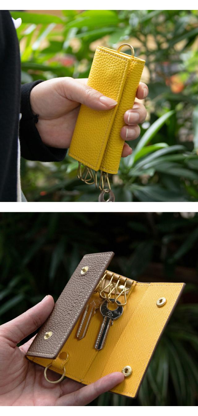 スマートな3つ折りデザインのキーケース、使いやすい6連フックと便利なキーリング1つ。ポケットもあるのでカード類に駐車券やお札などを入れることも可能です。外側に美しいシボ感のシュリンクレザー、内側には型押し加工を施したサフィアーノレザーを採用しました。生産は全てハンドメイドで。大量生産品では作れない丁寧な仕事をお楽しみください。選べる7色のバリエーション。きっと貴方のお気に入りのカラーが見つかります。