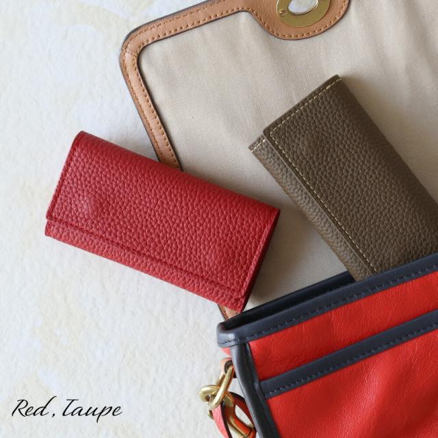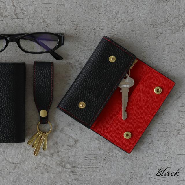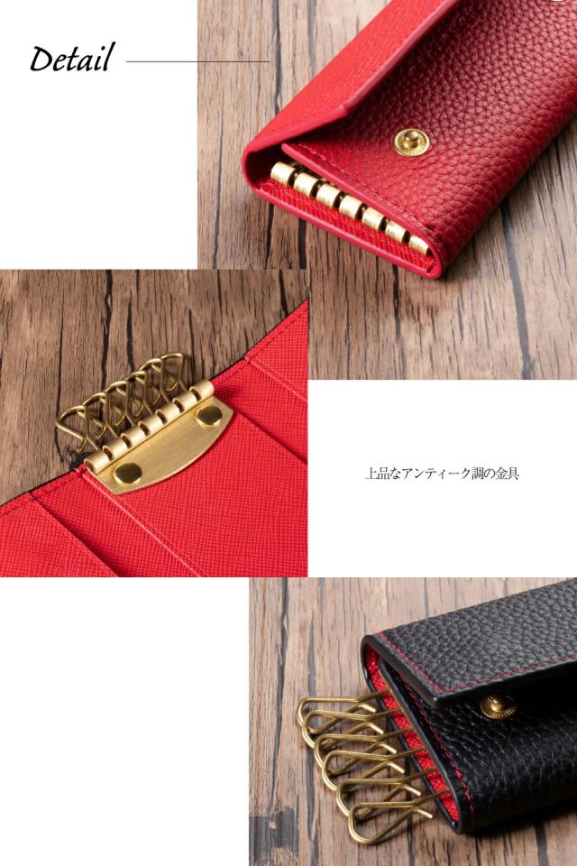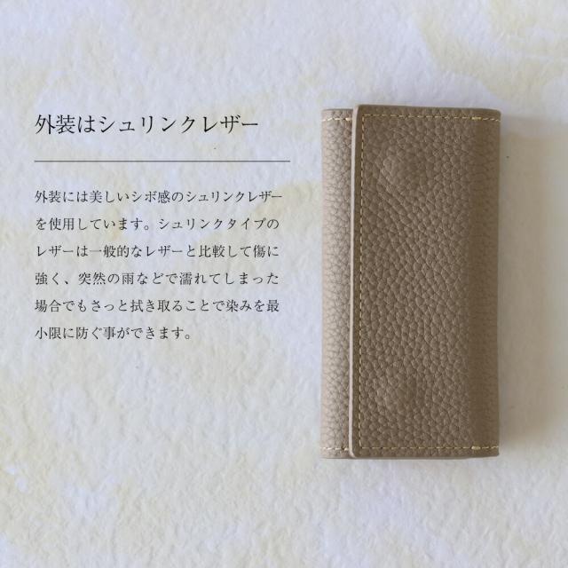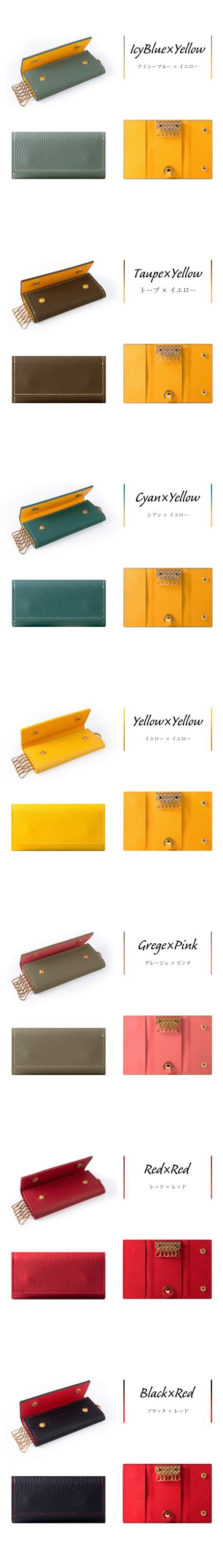 スマートな3つ折りデザインのキーケース、使いやすい6連フックと便利なキーリング1つ。ポケットもあるのでカード類に駐車券やお札などを入れることも可能です。外側に美しいシボ感のシュリンクレザー、内側には型押し加工を施したサフィアーノレザーを採用しました。生産は全てハンドメイドで。大量生産品では作れない丁寧な仕事をお楽しみください。選べる7色のバリエーション。きっと貴方のお気に入りのカラーが見つかります。