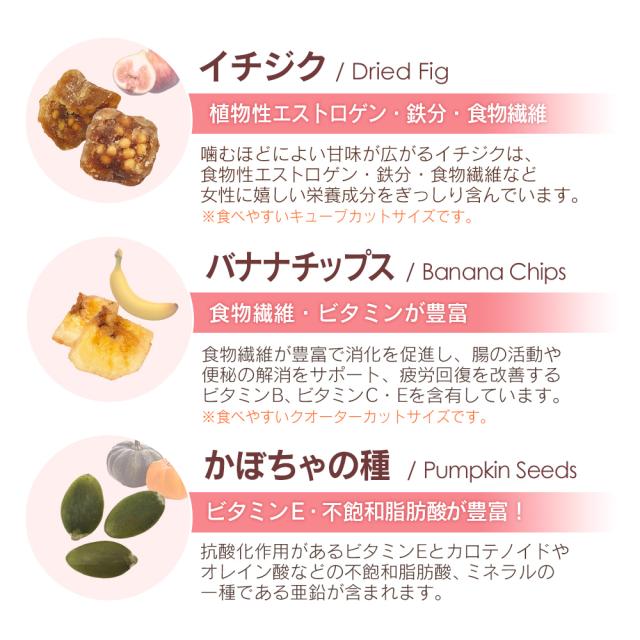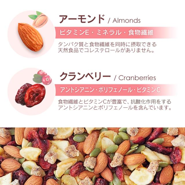 | アーモンド(アメリカ産)、バナナチップ(バナナ、ココナッツ油、砂糖)、乾燥クランベリー(クランベリー、砂糖、植物油脂)、乾燥イチジク(イチジク、米粉)、かぼちゃの種/香料
