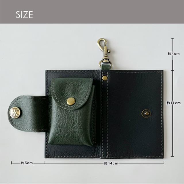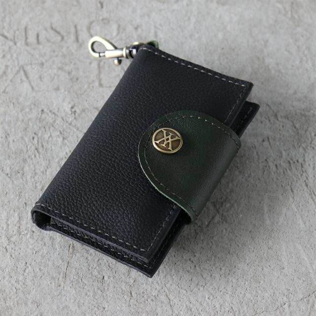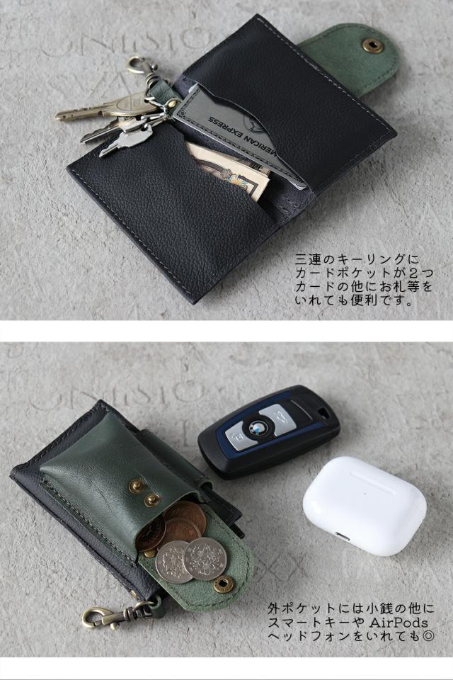 汎用性のあるポケットが3つついたキーケースです、「広め」かつ「深め」のポケットは一般的なカードサイズ(国際規格「ID-1」)であれば3枚は優に収納可能◎3つ折りにした紙幣を入れる事もできます。免許証とカードと紙幣数枚を忍ばせておくだけでとっても便利に移動できます。ミニマルでキャッシュレスな時代にマッチしたアイテムです。外側のポケットには小銭やスマートキー・AirPods(イヤフォン)なども収納可能。耐久性の高いアンティーク調の3連キーリングと同一の風合いのアンティーク調コンチョボタンで統一感を出しました。