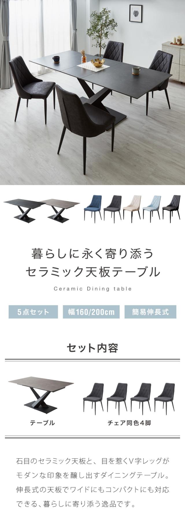 セラミック 伸長式ダイニングテーブルセット 幅160~200 伸縮 ダイニング5点セット 4人掛け 伸縮テーブル モダン 伸長式 ダイニング 耐水 耐熱 白 艶消し 傷がつきにくい おしゃれ(代引不可)【送料無料】