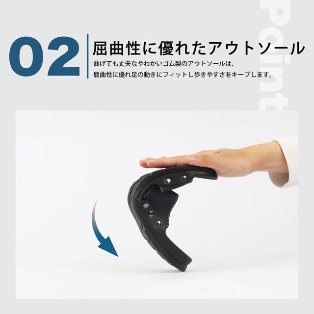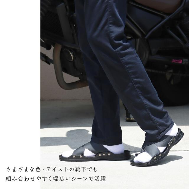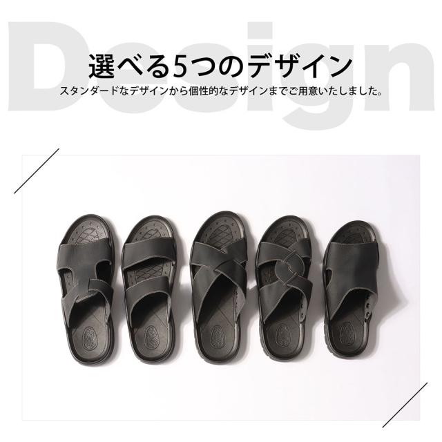 日本職人ハンドメイド、本革仕立てのちょっとオシャレなオトナのレザーサンダル。デザイン性と機能性の両立を目指しました。柔らかめのレザーを使用しているので、足に優しくフィットします。日本人の足のために作った職人お手製のアイテムは、まるで素足のような一体感の履き心地に。ソール部分には防滑パターンの組み込まれた剛性防滑素材を使用しているので、歩きやすく、疲れにくい仕様となっております。