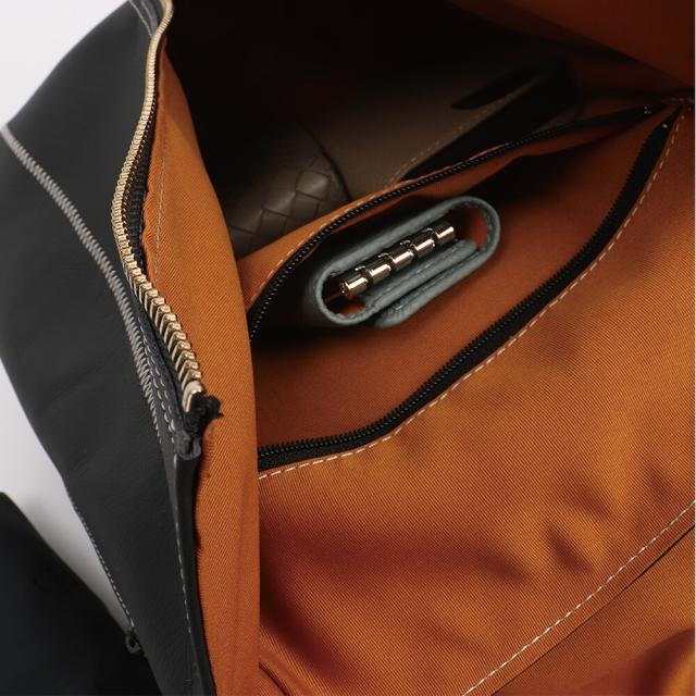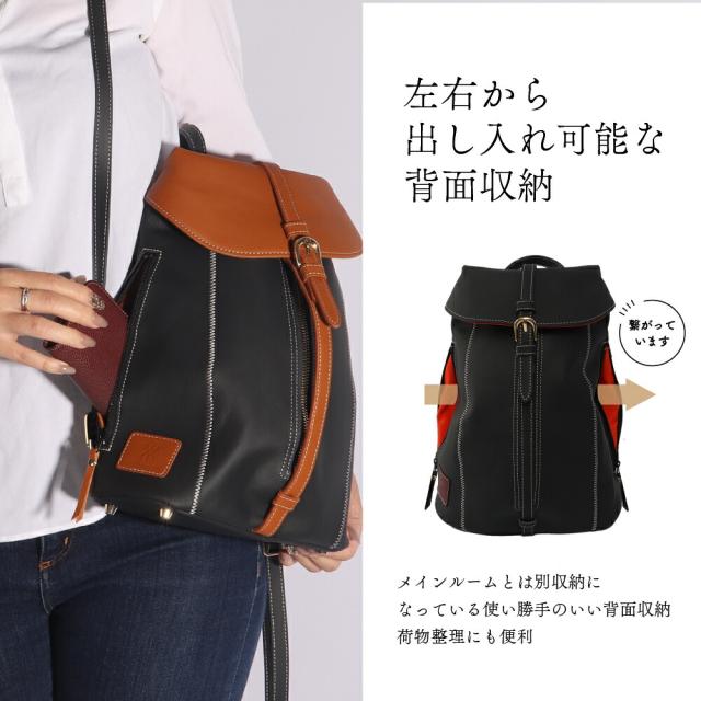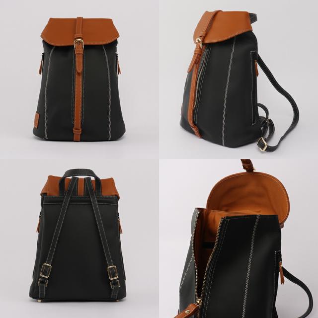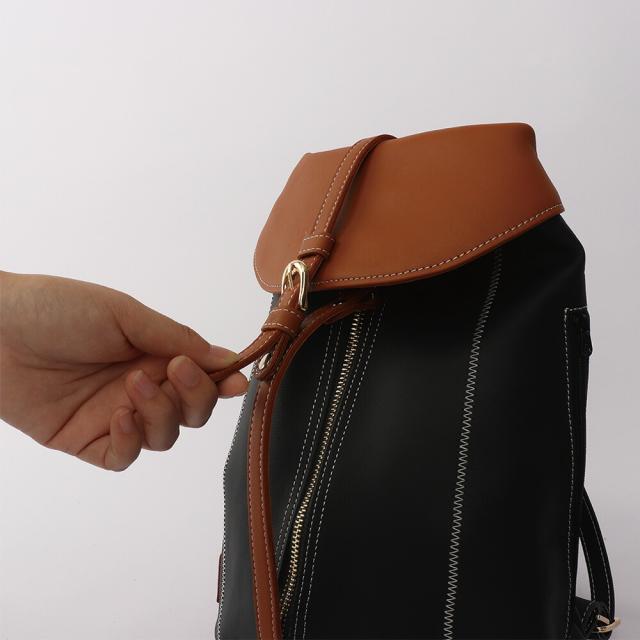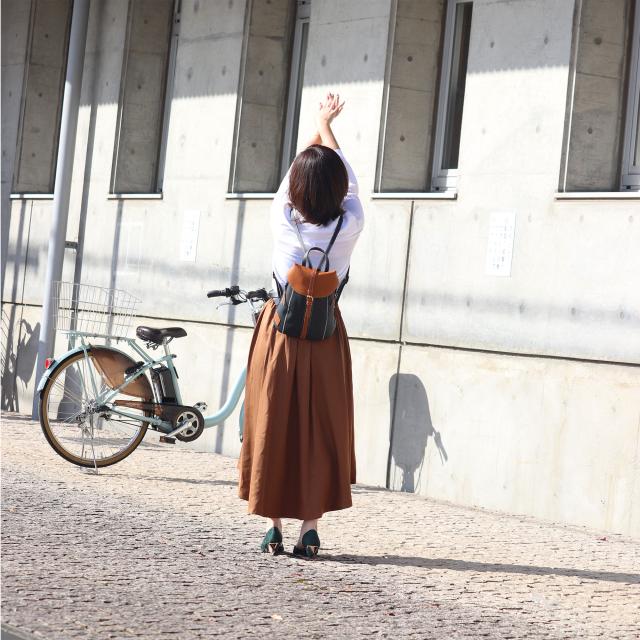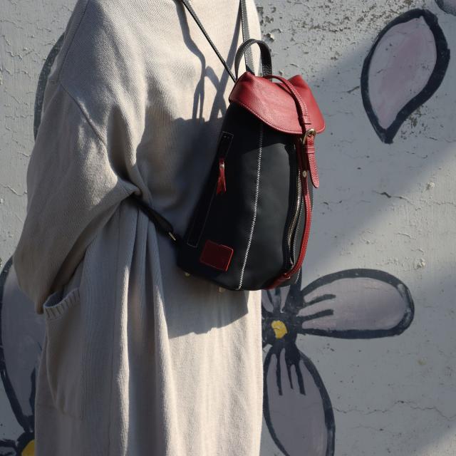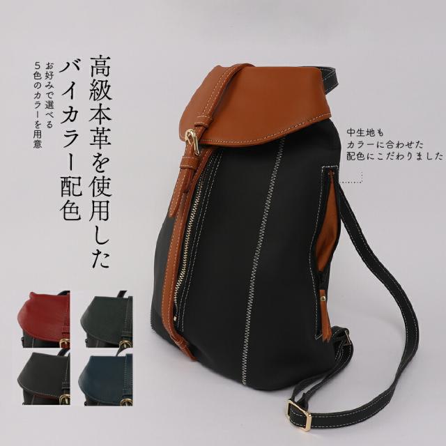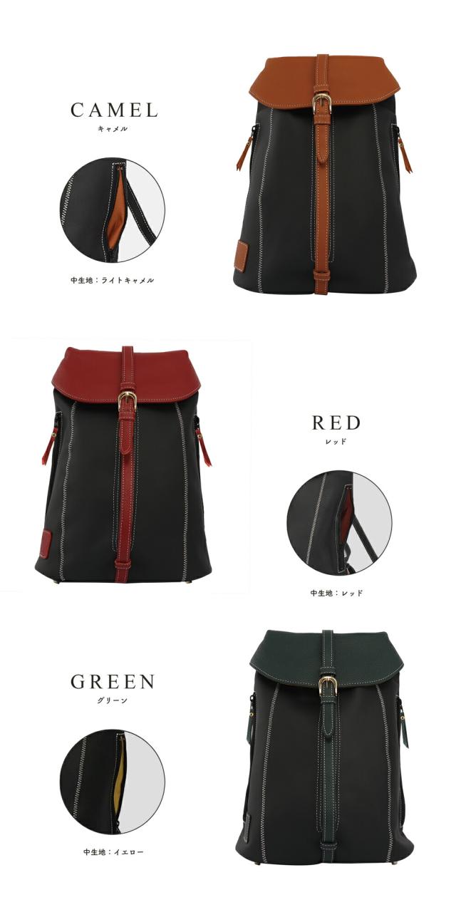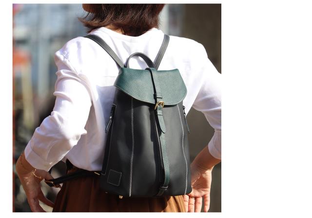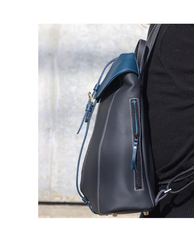 女性らしいサイズ感のオトナのミニリュック、総本革仕立て。すらっとした細身のフォルムに、ジグザグ縫いのステッチが美しく映えます。センターポケットは中央のファスナーで大きく広げられるので、荷物の出し入れのしやすさは抜群です。内部にはファスナーポケットを装備。背面ポケットは右からも左からも取り出しができる仕様です。センターポケットを開けずにお財布等を取り出せるのでとっても便利にお使いいただけます。ショルダーストラップ・持ち手部分も同素材の本革仕様。2枚の本革を重ね合わせて縫い付け、断面を美しく磨き上げております。底面に4点打った底鋲は、地面に置いた際の接地時ダメージを抑えます。インナーカラーはフラップ部分に合わせて、中身が見やすいカラーを使用しております。