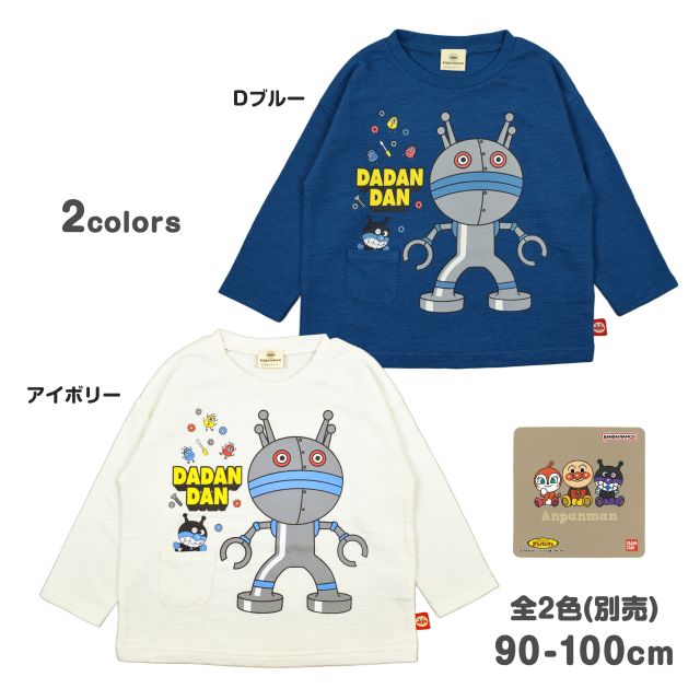 だだんだん2号 ばいきんまん かびるんるん プリント入り スラブ天竺 長袖カットソー です。身幅がちょっぴりゆったりめのシルエット。大きなだだんだんと右下のポケットから顏を出すばいきんまんの 可愛い プリント。スラブ天竺のさらりとした肌触りが気持ち良いTシャツです。左裾にアンパンマンのチケット付き。お名前タグ付き。