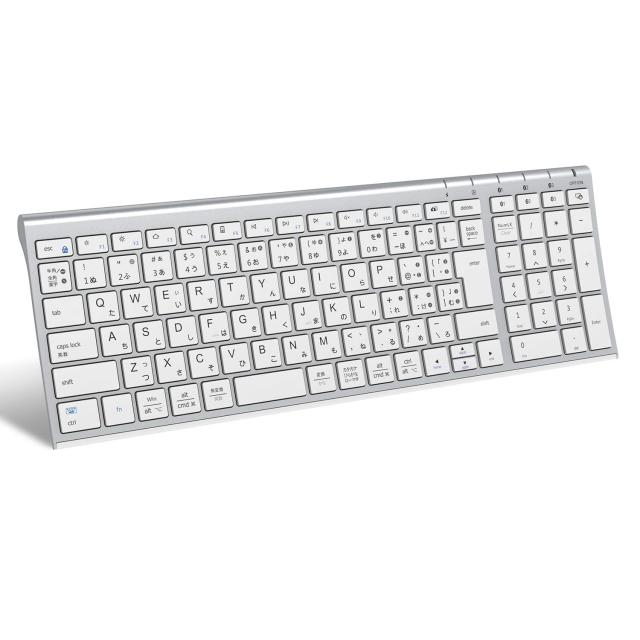 テンキー付き日本語配列ブルートゥースキーボードメールや原稿作成、数字を頻繁に入力する作業に最適、デスク上がスッキリするのがメリットです。3.95mm極薄の洗練されたボディ、シンプルでお洒落な外観、オフィスでも家でも使えます。本体寸法:36.6x12.5cm、キーボードの薄さ(奥1.6〜手前0.3cm)が作業をスピードアップさせます。ご不明点がございましたら、弊社のカスタマー・サービスにご連絡いただきますようお願いします。 タイピングしやすいノートPCと同じ「パンタグラフ方式」を採用しており、打ちやすい19mmキーピッチで、ネイルアートを施した指先でも操作しやすくなっています。浅めな1.8mmキーストロークは、静か、快適、滑らかなタイピング感を実現。軽い力でキーを押すことができるため、疲労を感じにくく、手首が一番リラックスした状態で入力できます。特にノートパソコンをよく使う方、高速入力を求める方におススメです。 マルチOS対応&OS自動識別:iOS、Android、Windowsのスマホ、タブレット、PC、ノートパソコンに使用可能(Bluetooth機能が必要)。また、接続先デバイスのOSを自動識別でき、面倒な初期設定をする必要がありません。iphone、iPad mini 、iPad 、iPad Air、iPad Pro、 Mac、ios、Anroid、Windows等のデバイスに対応できます。接続距離最大10メートルで安定な無線接続、操作もスムーズにできます。※iOS、iPadOSでは英語配列キーボードと認識されます(下記注記あり)。 Bluetoothで3台までのデバイスと接続できます:オペレーティングシステムの異なる最大3つのデバイスとペアリングが可能、ワンタッチで使用してデバイス間ですばやく切り替えることができます。Bluetooth5.1チップ搭載のため、接続の安定性を最大限に。 優れた耐久性と長時間使用可能キーボードの裏面に亜鉛メッキ鋼板が使用され、プラスチック製品より一段と高級感、品質感があります。素材の性質として、腐食されにくく、長年の使用に耐えられ、耐久性に優れている。USB-C充電式キーボードです。ただ2時間でフル充電、90時間連続使用可能。日本語取扱説明書付き、18ヶ月品質保証、日本語カスタマーサポート。