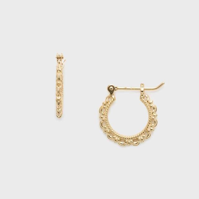 レースのような繊細な地金装飾で仕立てたフープピアス。正面からはシンプルなシルエットで顔周りをすっきりと見せながら、顔を動かした時に見えてくる側面の繊細な透かし模様が印象的なデザイン。タイニーチャームを組み合わせたコーディネートもおすすめです。※シリコンキャッチ付き。※天然石や天然素材を使用しているものは、サイズ・色味・風合いの違いや、若干の傷、内包物の有無などに個体差があります。予めご了承ください。