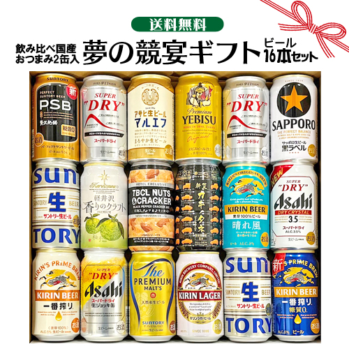 お歳暮 冬ギフト お誕生日 お祝い プレゼント ビール 16本/国産プレミアムビール おつまみ缶入り 16本飲み比べセット 夢の競宴 350ml×16本 おつまみ×2缶 サッポロエビス アサヒ サントリー 柿の種 【贈答・ギフト】詰合せ 送料無料(一部地域除く)