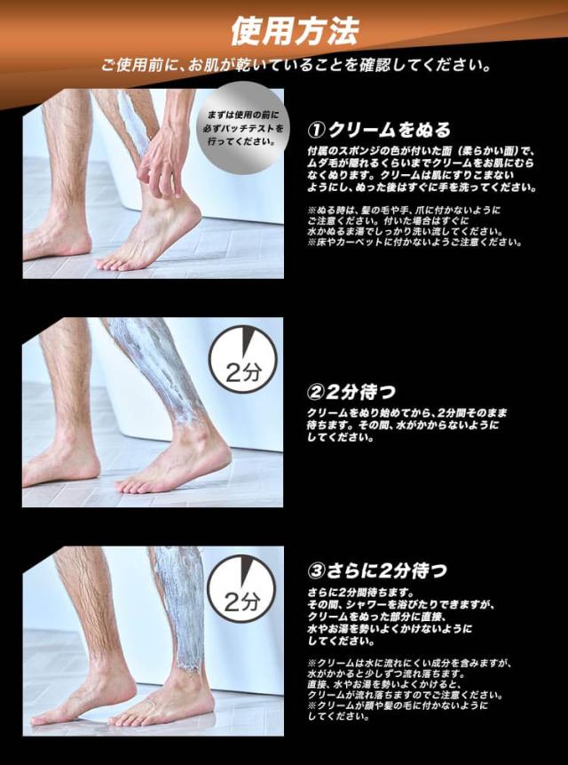 ・使用前テスト(バッチテスト)は初めて使う場合を含め毎回必ず行ってください。少量のクリームを、除毛したい部分にぬり、4分経過後、水または、ぬるま湯でお肌をきれいに洗い流します。その後、24時間以上たって、お肌に異常(赤み、はれ、かゆみ、刺激、色抜け(白斑等)、黒ずみ、ヒリヒリ感、痛み、かぶれ等)がないことを確かめてからご使用ください。異常が現れた場合は、使用しないでください。また、ぬってすぐにお肌に異常が現れた場合は、4分待たずに洗い流してください。症状が改善しない場合は、皮膚科専門医へご相談ください。
