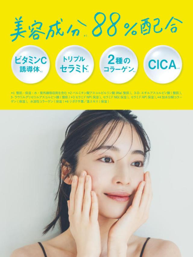 | 水、PEG-50水添ヒマシ油、オクトクリレン、ペンチレングリコール、サリチル酸エチルヘキシル、BG、t-ブチルメトキシジベンゾイルメタン、エトキシジグリコール、エチルヘキシルトリアゾン、パルミチン酸アスコルビルリン酸3Na、3-0-エチルアスコルビン酸、3-ラウリルグリセリルアスコルビン酸、ヒアルロン酸ヒドロキシプロピルトリモニウム、セラミドNP、セラミドAP、セラミドNG、リンゴ果実培養細胞エキス、アルブチン、グリチルリチン酸2K、バクチオール、ビサボロール、ツボクサ葉/茎エキス、ヘキサカルボキシメチルジペプチド-12、加水分解コラーゲン、水溶性コラーゲン、ビスエチルヘキシルオキシフェノールメトキシフェニルトリアジン、クエン酸Na、クエン酸、ベヘニルアルコール、ペンタステアリン酸ポリグリセリル-10、ステアロイルラクチレートNa、キサンタンガム、フィトスフィンゴシン、グリセリン、レシチン、フェノキシエタノール |