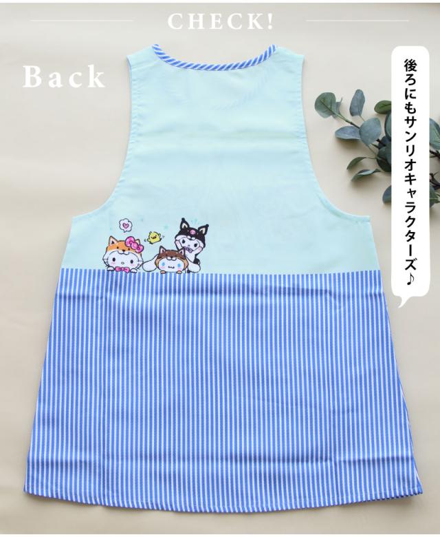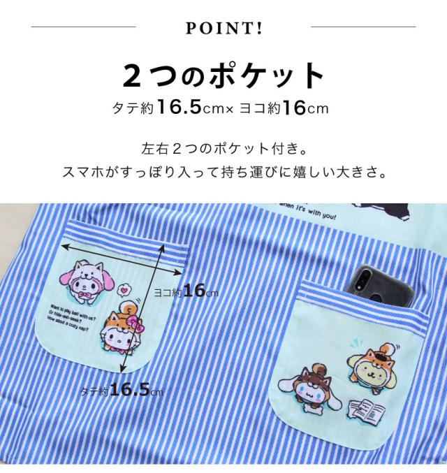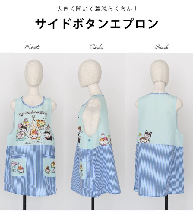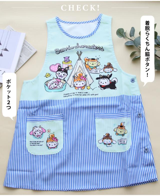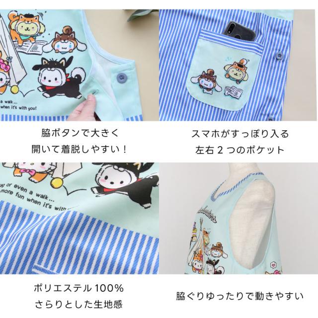 サンリオキャラクターズデザインが可愛らしい脇ボタンエプロン!スマホがすっぽり入って使いやすい2つのポケットに、動きやすいひざ上丈で使いやすさもバッチリ。シワになりにくいさらりとした生地感は、毎日のお手入れもラクチン!保育士・介護士さんにおすすめです。
