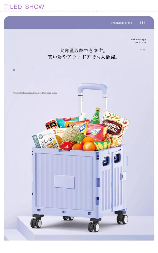 | 組立簡単。持ち運びに便利なキャリーカート。4輪 キャスター付!ショッピングやアウトドアでも大活躍。 コンパクトに折りたためて便利。使わない時にしまえるので、邪魔にならない。 大容量収納できます。買い物やアウトドアでも大活躍。 ハンドルは2段階で長さの調節ができます。子供も大人も使いやすい。 頑丈で変形破損もなく疲れた時の椅子代わりでも! サッと折り畳める。スライド式ロックで操作しやすい。 | |