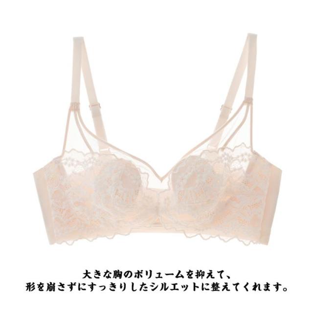 | 見た目も素敵で、胸を小さく見せるブラ♪ バストの突出をおさえ、形を崩さずきれいにボリュームダウンする着やせ効果のあるブラジャー。 大きな胸のボリュームを抑えて、形を崩さずにすっきりしたシルエットに整えてくれます。 女性らしさたっぷりのレースデザイン、年齢問わず愛される間違いなしです。 | |