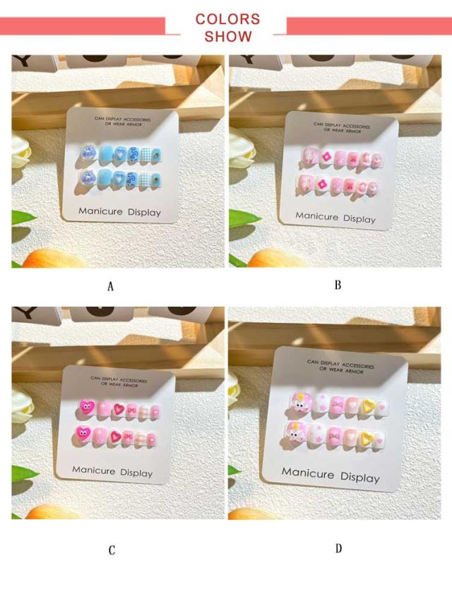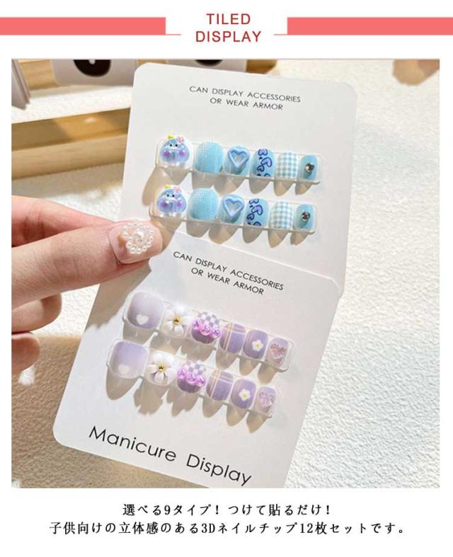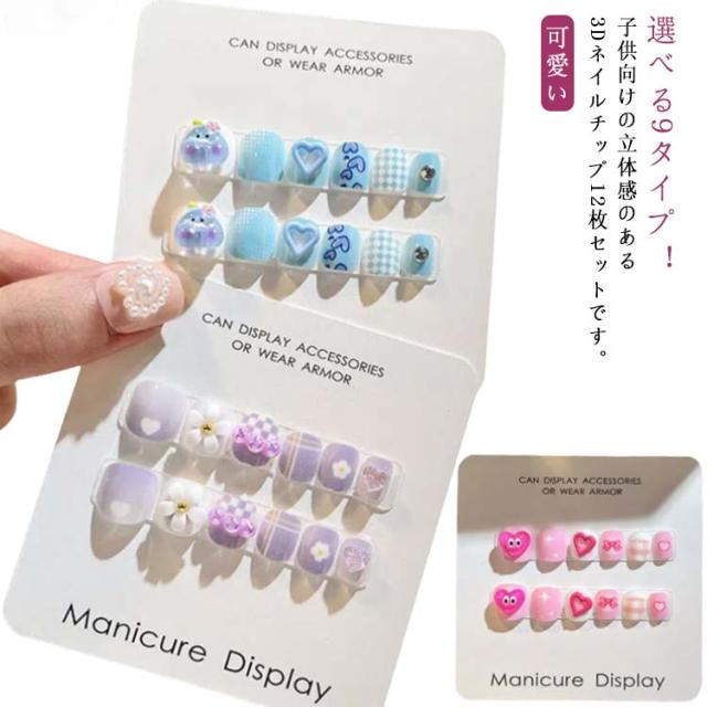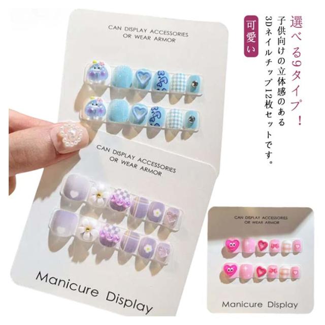 | 選べる9タイプ!つけて貼るだけ!子供向けの立体感のある3Dネイルチップ12枚セットです。 貼るだけなので、爪への負担は少なく、オフも簡単です。 立体感があってポップで可愛いです。 普段使いやおでかけにもぴったりです。 | |