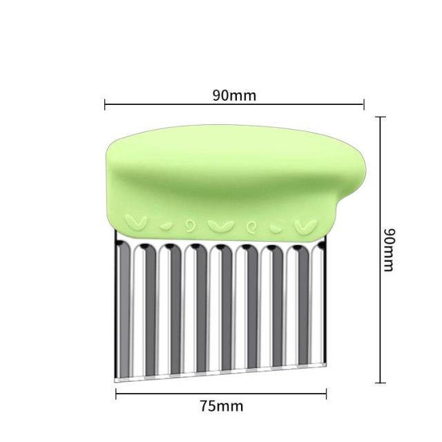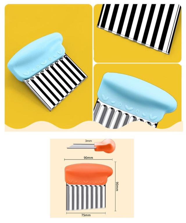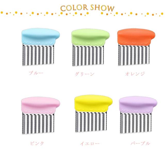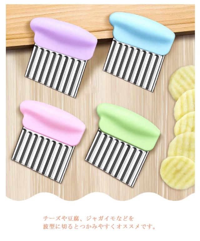 | 野菜や果物の飾り切りに! 切り口をキレイな波型にスライスできます。 お店みたいなカッティングが家で簡単手軽に完成です。 じゃがいもをカットし揚げれば、なみなみフライドポテトに。 チーズや豆腐、ジャガイモなどを波型に切るとつかみやすくオススメです。 | |