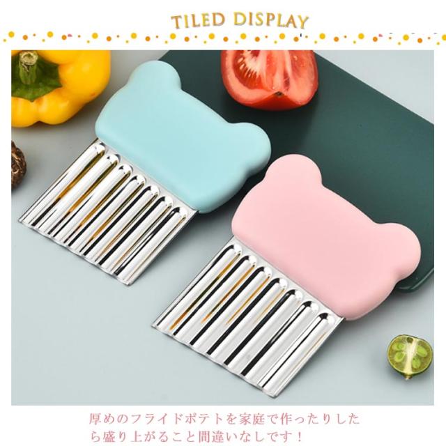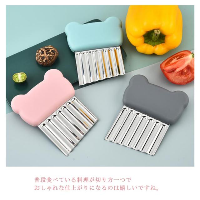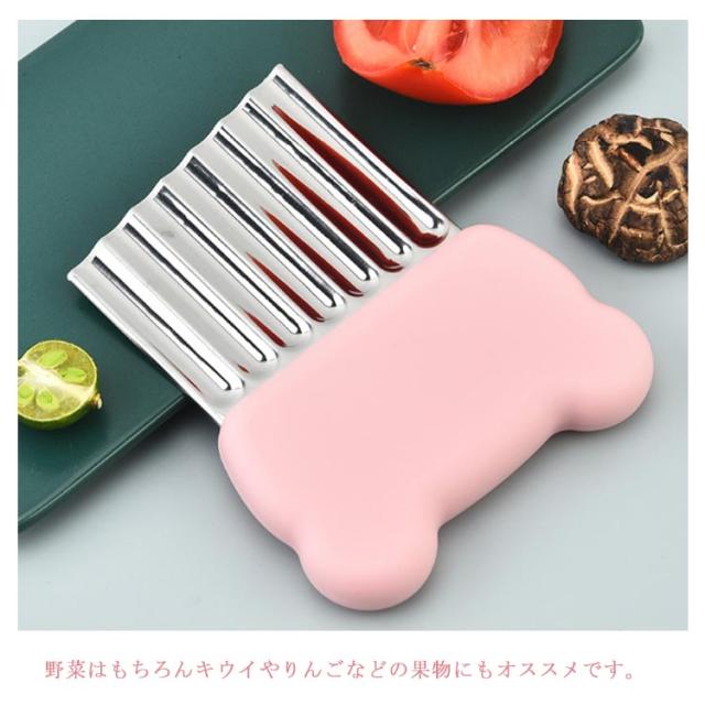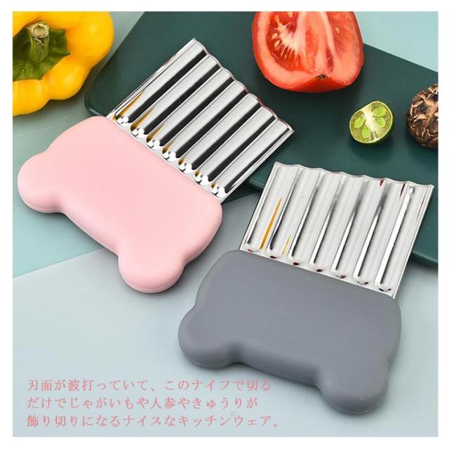 | 普段食べている料理が切り方一つでおしゃれな仕上がりになるのは嬉しいですね。 厚めのフライドポテトを家庭で作ったりしたら盛り上がること間違いなしです! 刃面が波打っていて、このナイフで切るだけでじゃがいもや人参やきゅうりが飾り切りになるナイスなキッチンウェア。 野菜はもちろんキウイやりんごなどの果物にもオススメです。 | |