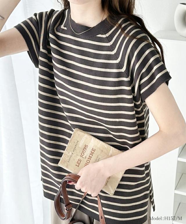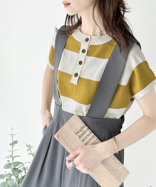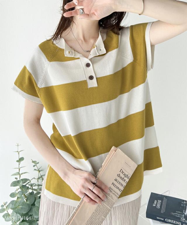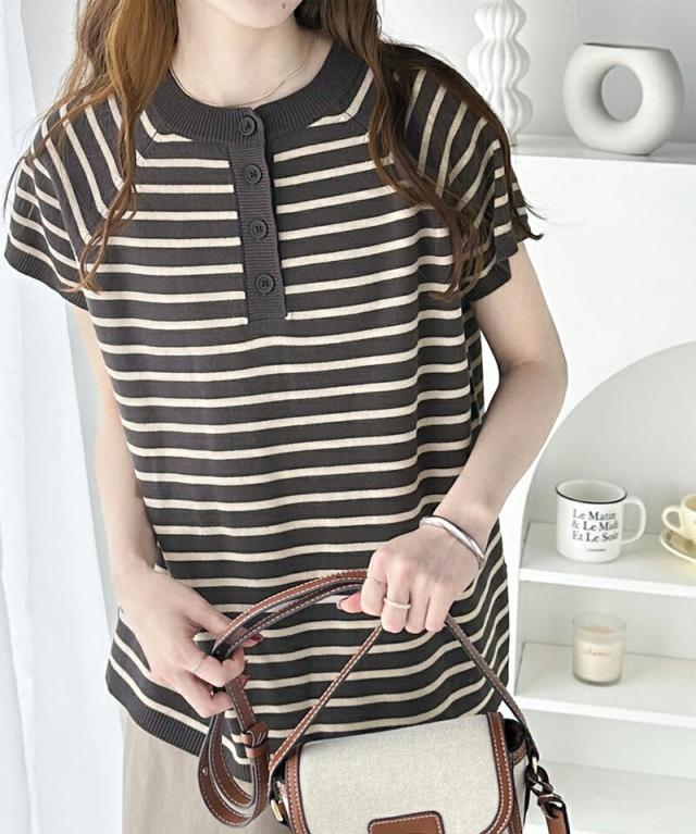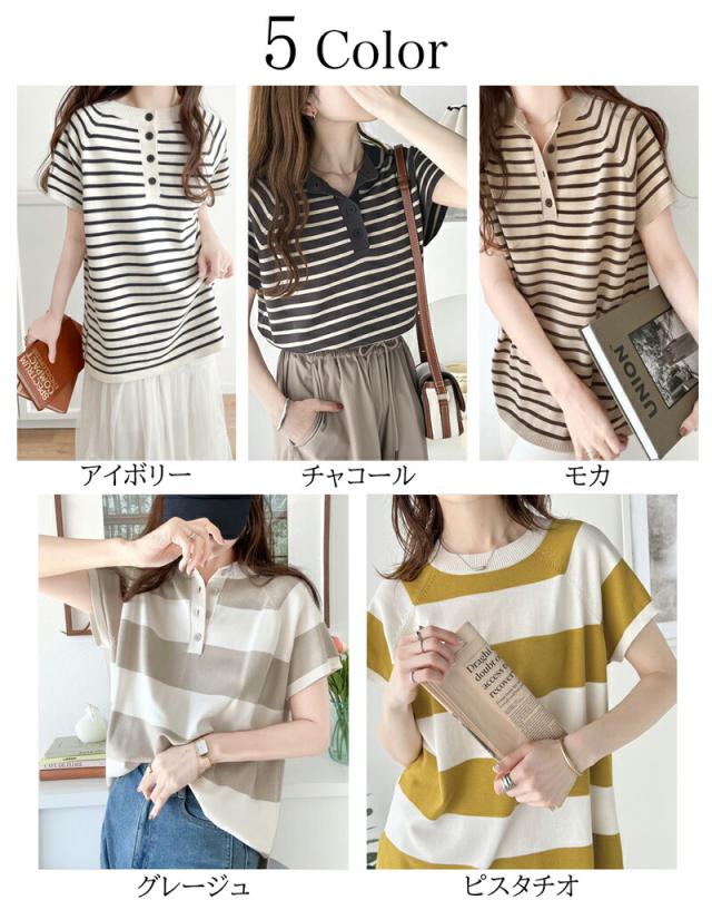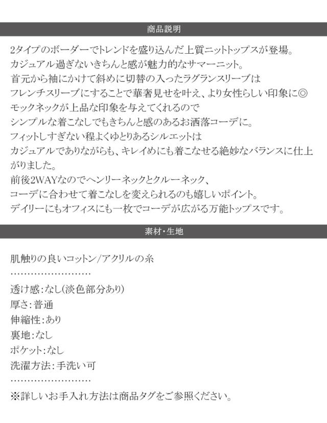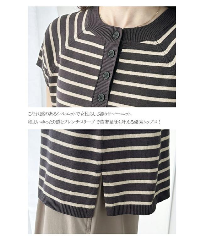 クラシカルエルフ 冬新作 トップス ニット レディース 前後2way バックヘンリー 編み ボーダー 半袖 フレンチスリーブ ラグラン プルオーバー モックネック ヘンリーネック リブ 着回し 程よい フィット感 大きいサイズ 2024ss ce1050155