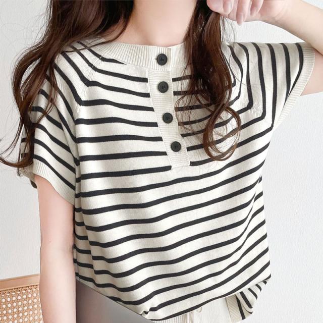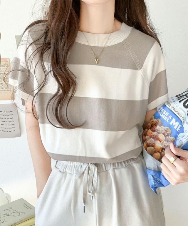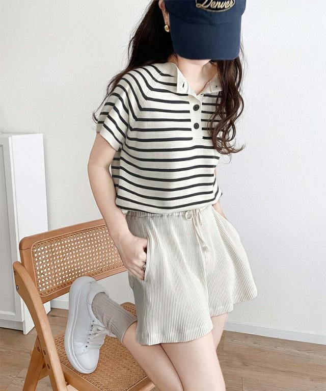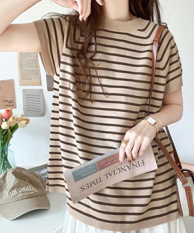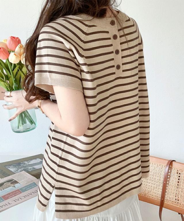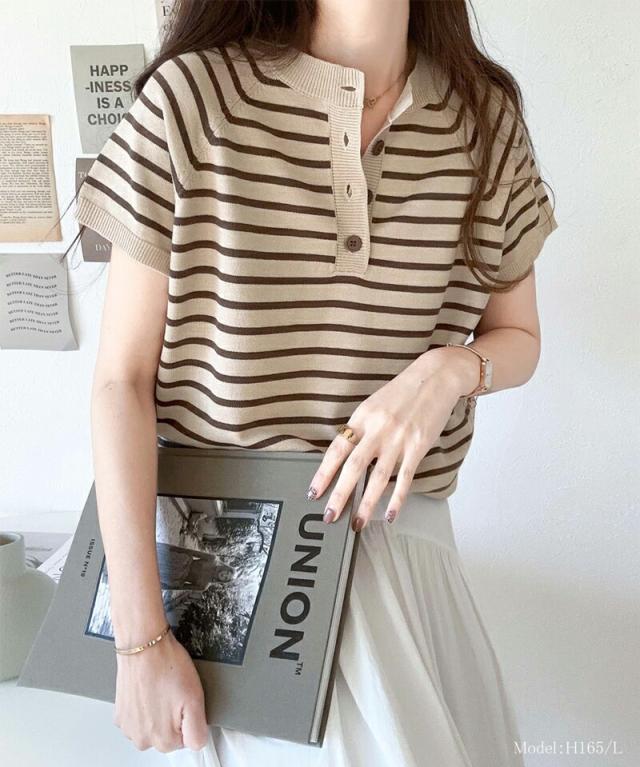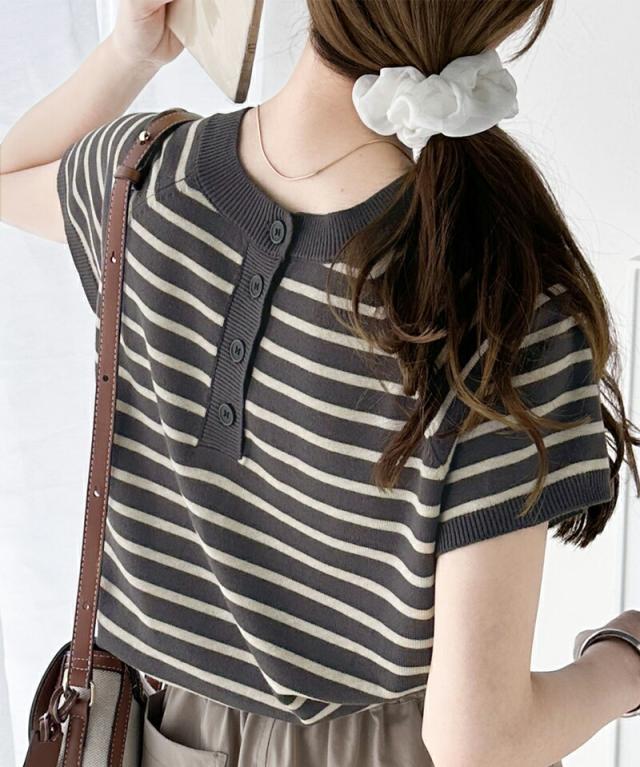 クラシカルエルフ 冬新作 トップス ニット レディース 前後2way バックヘンリー 編み ボーダー 半袖 フレンチスリーブ ラグラン プルオーバー モックネック ヘンリーネック リブ 着回し 程よい フィット感 大きいサイズ 2024ss ce1050155