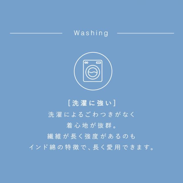 シルキーな光沢、やわらかな肌触りが特徴の、インド綿のみでできているので、肌触り気持ち良い。洗濯してもゴワツキがなく滑らかさが続きます。