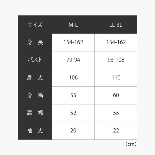 ■サイズ:身長154-162、M-L/バスト79-94、身丈106、身幅55、肩幅52、袖丈20、LL-3L/バスト93-108、身丈110、身幅60、肩幅55、袖丈22cm。モデル/身長162cm、Mサイズ着用。