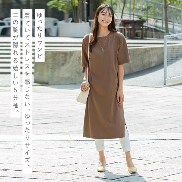 首元は少し開きを抑え、二の腕が隠れる5分丈も嬉しい。たっぷりとストンと落ちるラインで体型もスッキリ見えます。伸びやすい肩のラインをテープで補強しているので丈夫です。