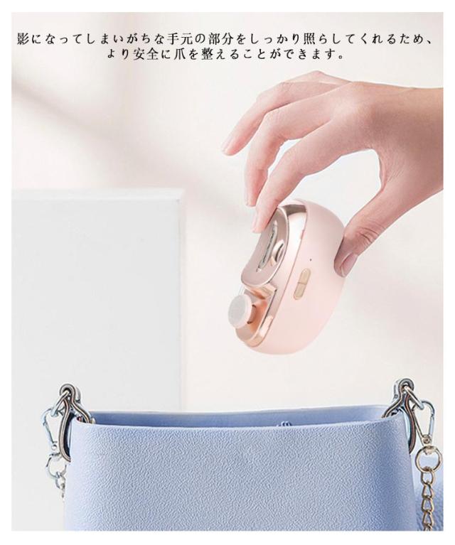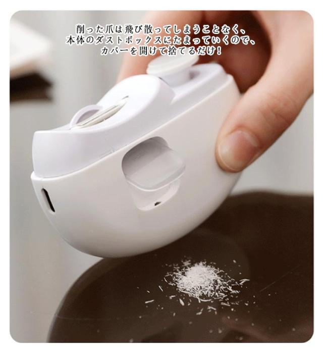 | 【2in1回転式電動爪切り】「爪切り」、「爪磨き」2役を1台、徐々に爪の半円を描くように動かし均等に削れるので、切りすぎを防げる!360°回転式爪磨きで、爪の表面もピカピカ!清潔感がアップします。 【2段階回転速度】2段階スピード調節可能で好みの速さで爪を整えられます。削った爪は飛び散ってしまうことなく、本体のダストボックスにたまっていくので、カバーを開けて捨てるだけ! 【LEDライト付き】影になってしまいがちな手元の部分をしっかり照らしてくれるため、より安全に爪を整えることができます。子ども・高齢者・介護者・視覚にハンディがある人など誰でも使いやすく配慮しています。 【静音・低振動設計】静音・低振動設計で、稼働音はわずか40dB。赤ちゃんが寝ている間に爪切りを終えられてしまうかも。 【USB充電式】付属のUSBケーブルでさっと充電が可能!約2~3時間で充電が完了し、なんと約3ヶ月間も待機できます。充電式なので、電池式と違い電池を買う手間も入れ替える手間も必要ありません。 | |