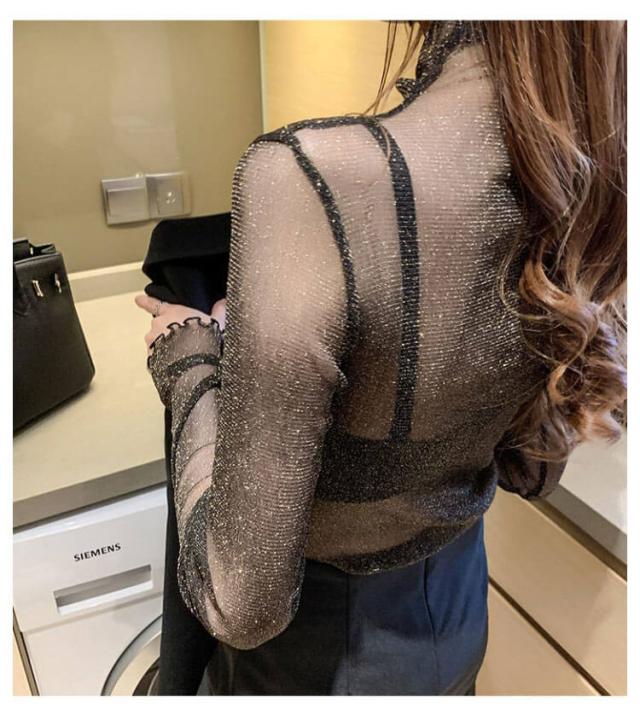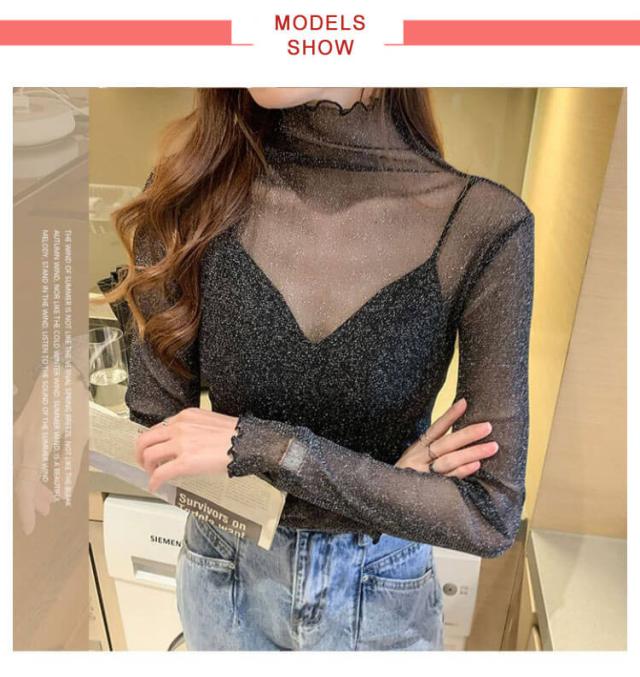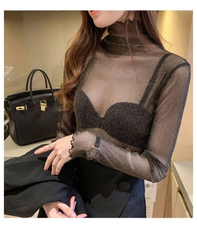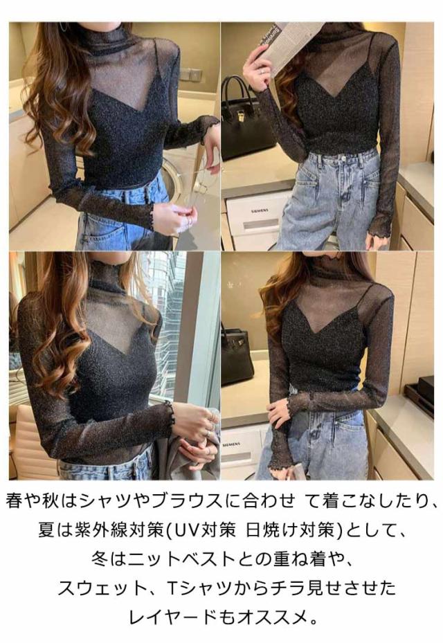 キラキラ 無地 長袖 シースルー タートルネック 薄手 春服 シアートップス 夏 春 レイヤード Tシャツ カットソー レディース チュールトップス メロウ インナー キラキラ ラメ入り フリル トップス 伸縮 重ね着 ハイネック 夏 夏服 紫外線対策 日焼け対策 フェミニン