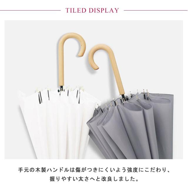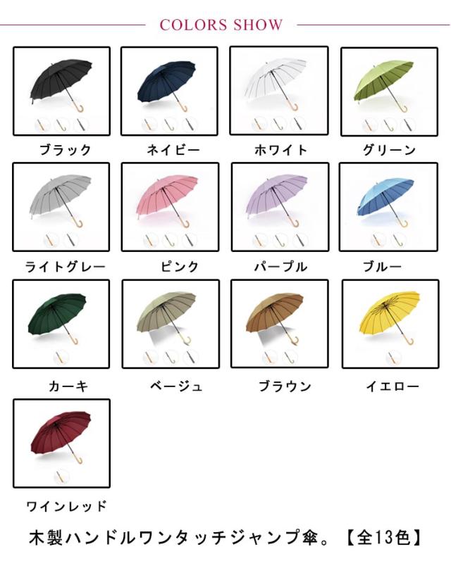 | 木製ハンドルワンタッチジャンプ傘。【全13色】 16本骨が作り出す和傘のような造形美を残しながら現代風にアレンジされたデザインで、どの角度から見ても美しいシルエットが魅力です。 手元の木製ハンドルは傷がつきにくいよう強度にこだわり、握りやすい太さへと改良しました。 丈夫なグラスファイバー製骨を使用しており、強い風にもしなって折れにくい。 直径105cmの大きめサイズで大雨の日や荷物が多い日も安心。 和の雰囲気を醸し出す、持ちやすい木製の持ち手。 撥水加工で、軽く振るだけで、水滴が簡単に振り払えます。 シンプルなデザインと使いやすいカラーバリエーションで男女問わずお使いいただけます。 | |