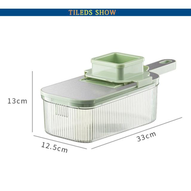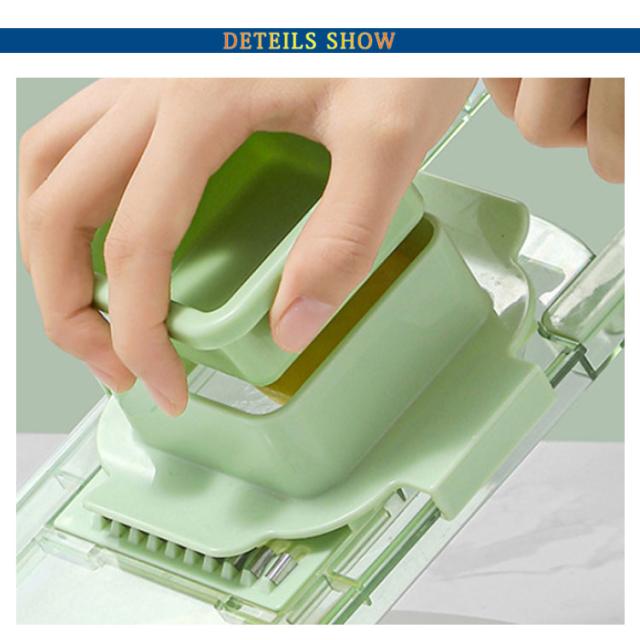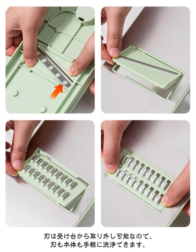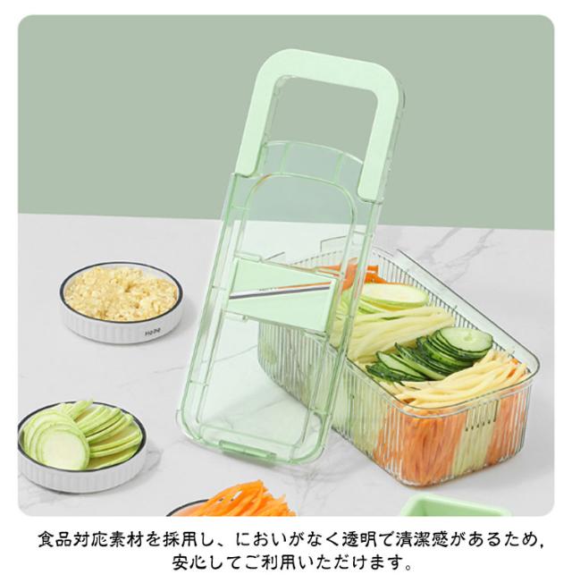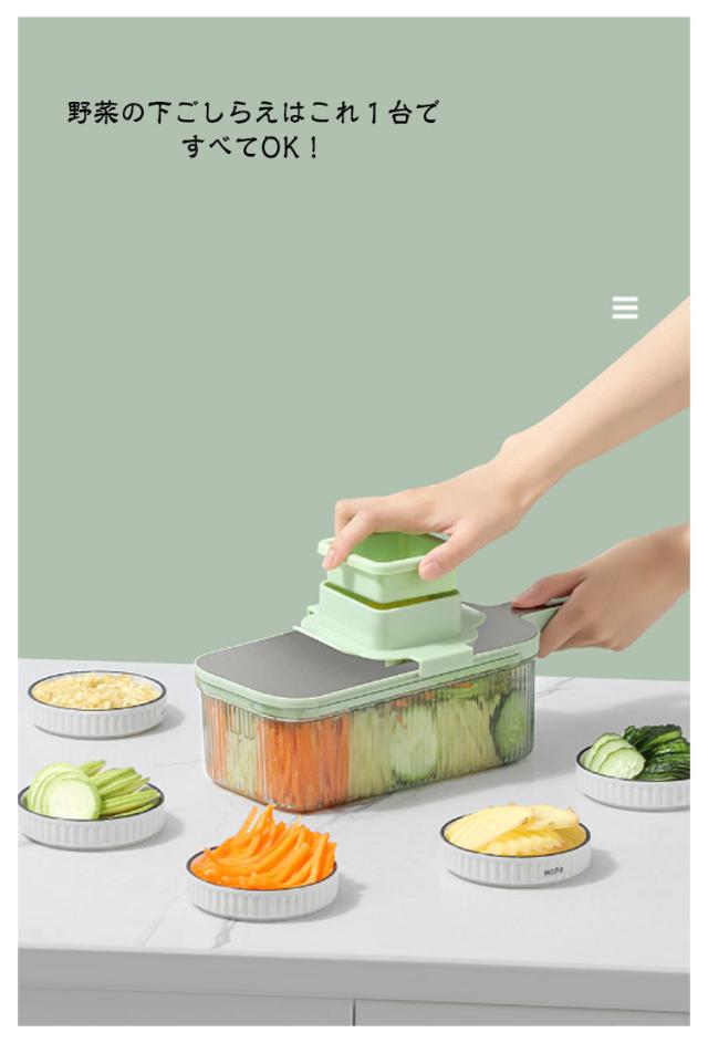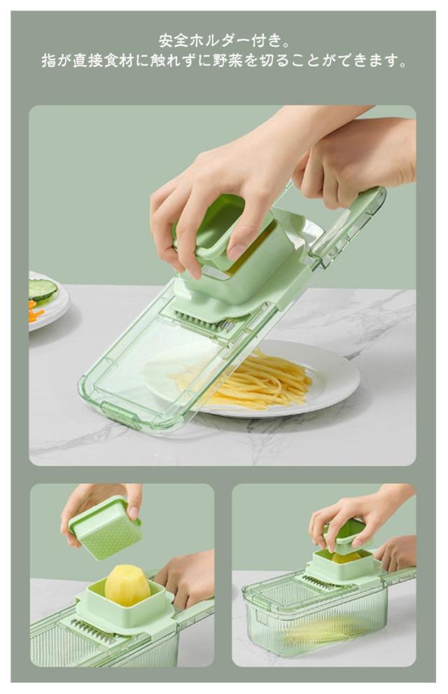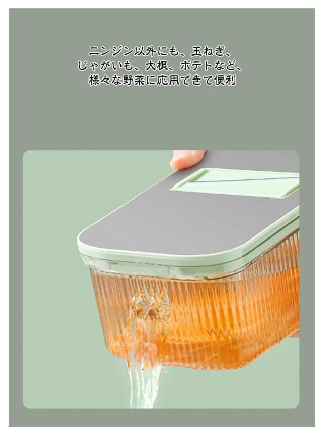 | 【9点セット】【一台8役】【水切り機能】 野菜の下ごしらえはこれ1台ですべてOK! ニンジン以外にも、玉ねぎ、じゃがいも、大根、ポテトなど、様々な野菜に応用できて便利 安全ホルダー付き。指が直接食材に触れずに野菜を切ることができます。 野菜や果物のみじんぎり、太めの千切り、細めの千切り、すりおろし、花形切り、水きり等計8つの機能が簡単にご使用いただけます。 食品対応素材を採用し、においがなく透明で清潔感があるため,安心してご利用いただけます。 ステンレス製の刃のため錆びにくく耐久性にも優れており、長期間使っても切れ味抜群です。 刃は受け台から取り外し可能なので、刃も本体も手軽に洗浄できます。 セット内容:水切り皿*1、受台*1、安全ホルダー*1、スライサー*6 | |