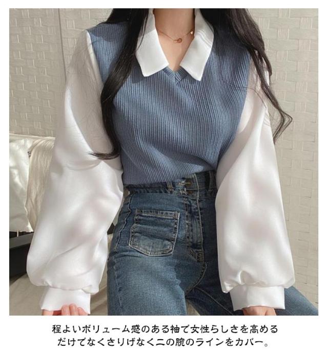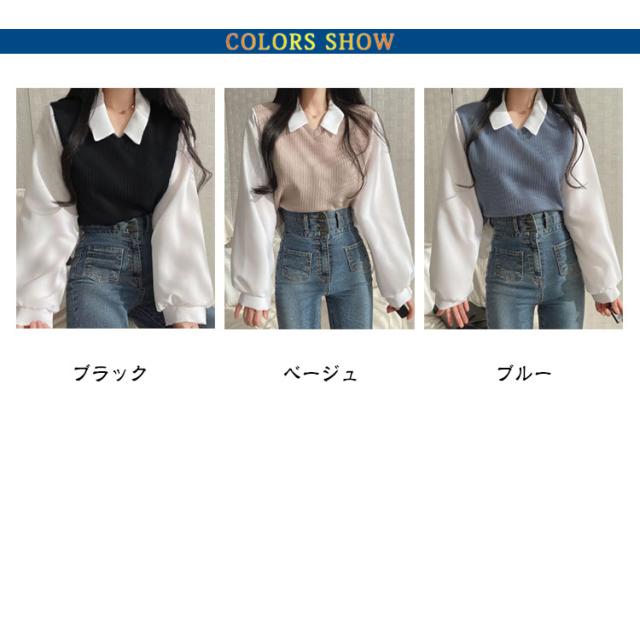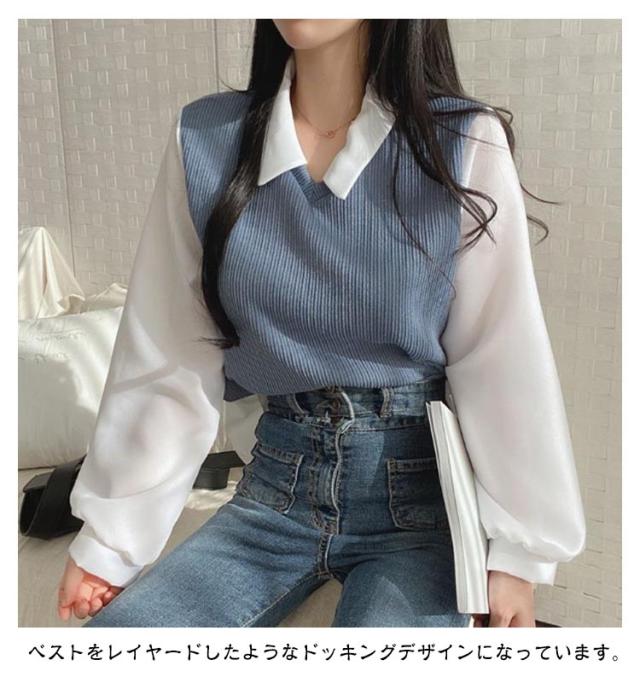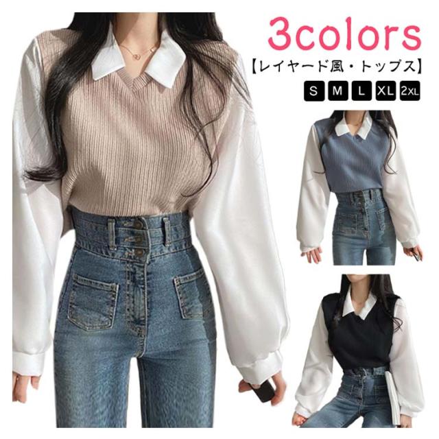 トップス プルオーバー リブ 襟付き ドッキング 長袖 レイヤード風 シャツ 重ね着風 レディース パフスリーブ 無地 配色 バイカラー Tシャツ 春秋 異素材切り替え フェイクレイヤード 大きいサイズ ポロシャツ