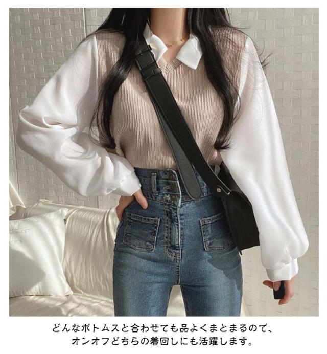| 【S〜XXL】【レイヤード風・トップス】【3colors】 選べるS〜XXLサイズ展開!レイヤード風異素材切り替えトップス♪ ベストをレイヤードしたようなドッキングデザインになっています。 程よいボリューム感のある袖で女性らしさを高めるだけでなくさりげなく二の腕のラインをカバー。 どんなボトムスと合わせても品よくまとまるので、オンオフどちらの着回しにも活躍します。 レイヤード風デザインのため、デニムやシンプルなボトムスと合わせるだけでお洒落な着こなしが完成します。 ON/OFFで着回せるデザイン配色襟が大人のきちんと感を演出する。 | |