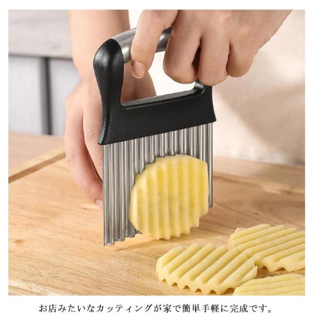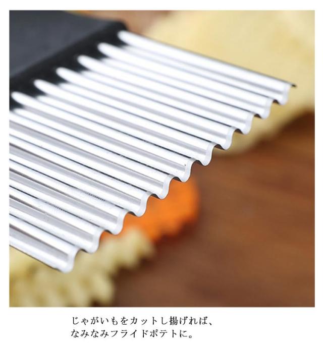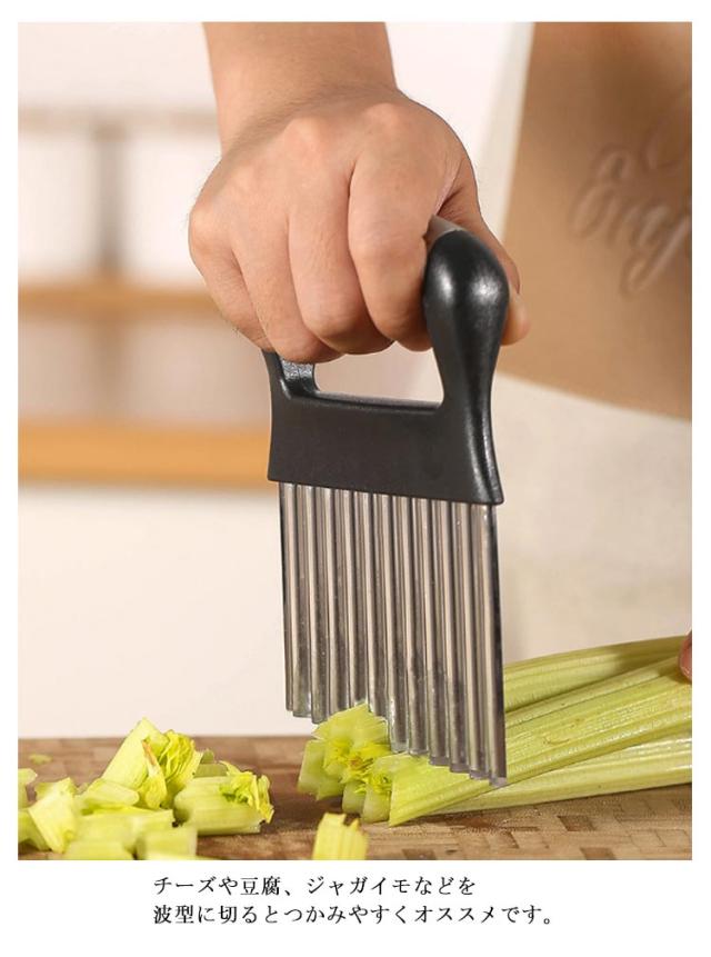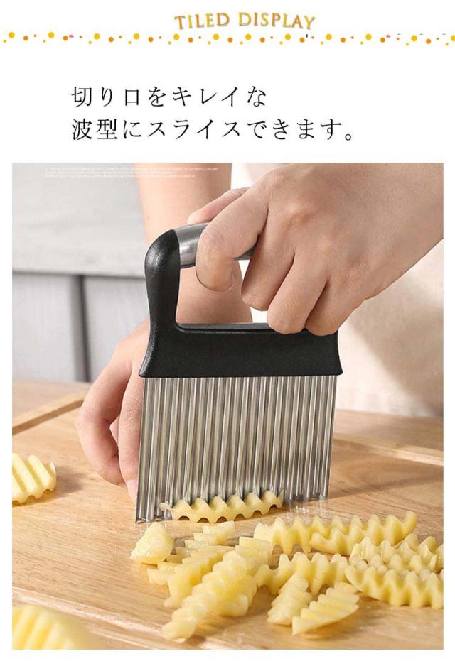 | さまざまな食材がこのカッターで楽しい形に変身! 切り口をキレイな波型にスライスできます。 お店みたいなカッティングが家で簡単手軽に完成です。 じゃがいもをカットし揚げれば、なみなみフライドポテトに。 チーズや豆腐、ジャガイモなどを波型に切るとつかみやすくオススメです。 | |