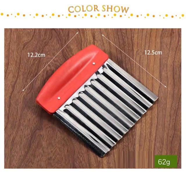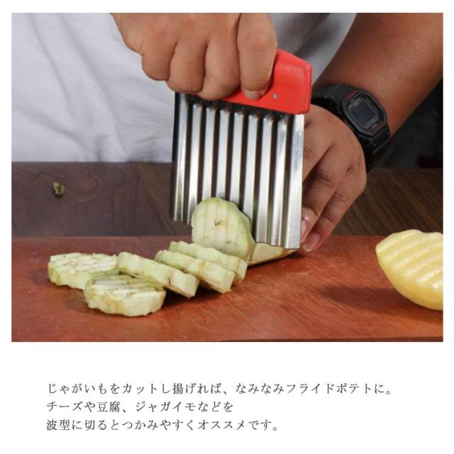 | 切り口をキレイな波型にスライスできます。 お店みたいなカッティングが家で簡単手軽に完成です。 じゃがいもをカットし揚げれば、なみなみフライドポテトに。 チーズや豆腐、ジャガイモなどを波型に切るとつかみやすくオススメです。 | |