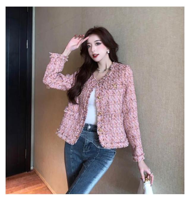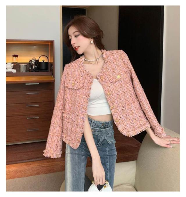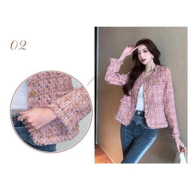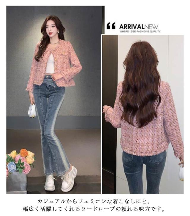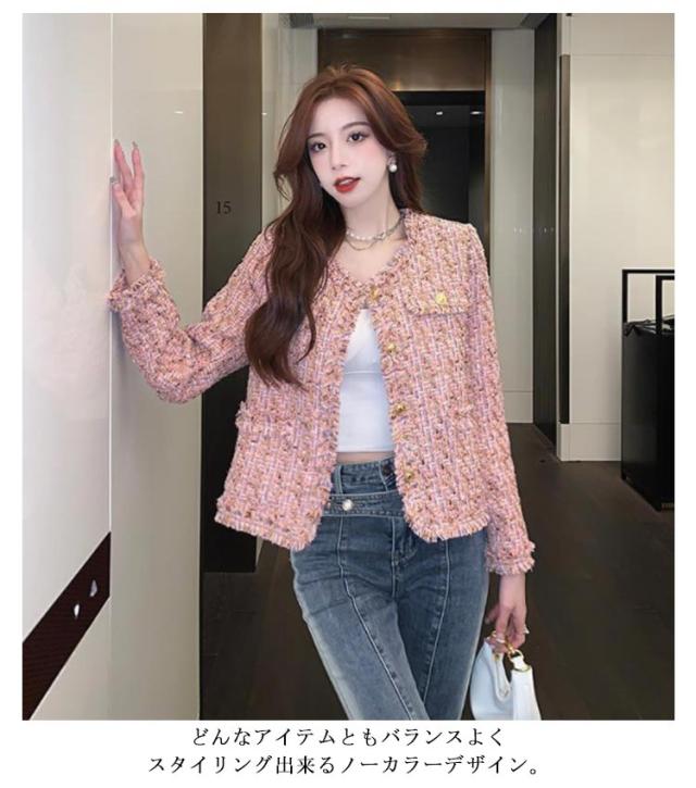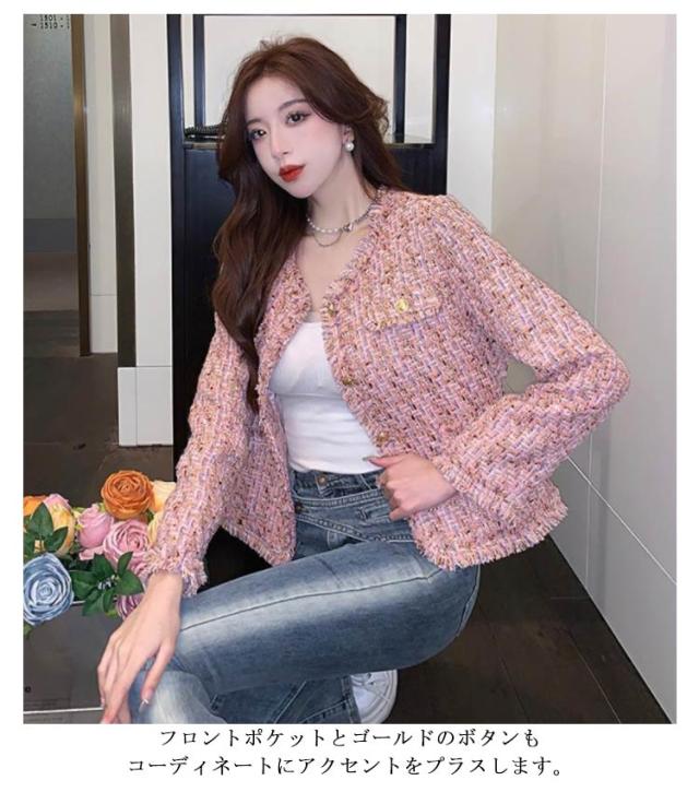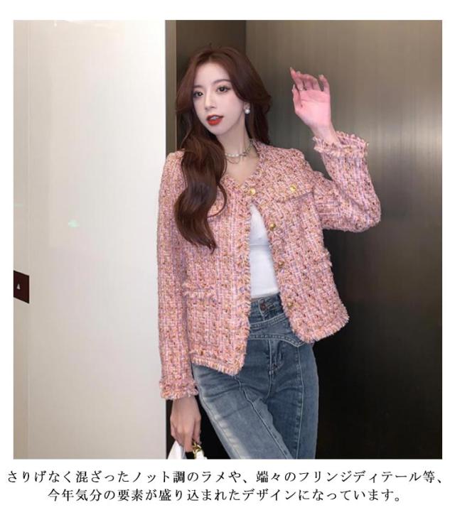 ジャケット フリンジ レディース ショート丈 ラメ ノーカラー ツイード ピンク 春 ノーカラージャケット ツイードジャケット 金ボタン 薄手 羽織り アウター 入学式 卒業式 セレモニー 普段使い 通勤 オフィス カジュアル フェミニン おしゃれ