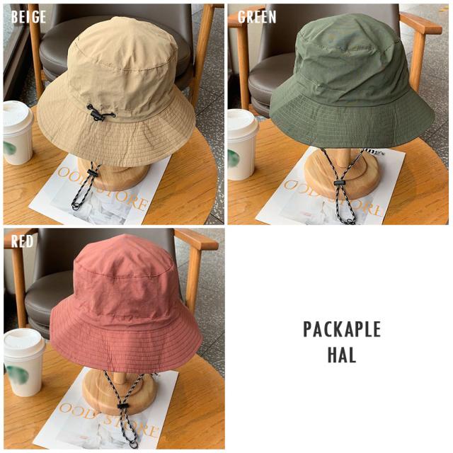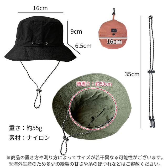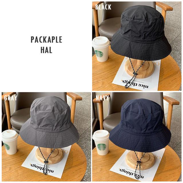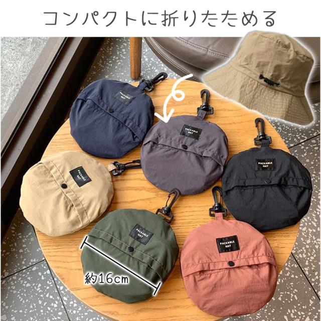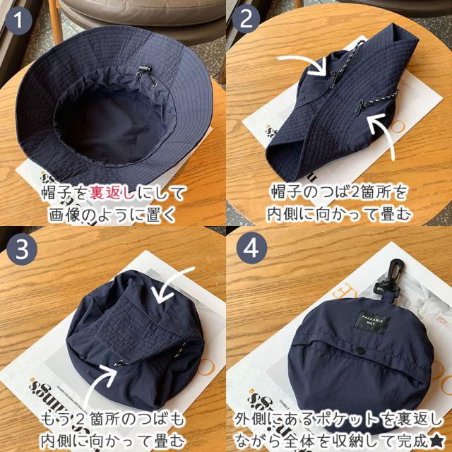 【パッカブル】パッカブルとは、コンパクトに包装が可能なという意味です。帽子とは別にポーチなどの入れ物は必要なく、帽子そのものを折りたたんで収納できる構造になっています。折りたたんだ状態にすると吊り下げるためのフックもあるので、バッグやベルト通しなどにつけて持ち運びも簡単にできます。折りたたみ方法は商品説明画像、または動画を確認ください。