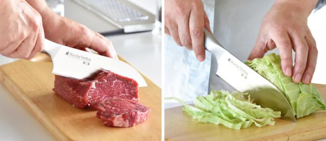 職人の手による水砥刃付けで、鋭い切れ味を実現しました。お肉、魚、野菜に使えるオールマイティな1本です。