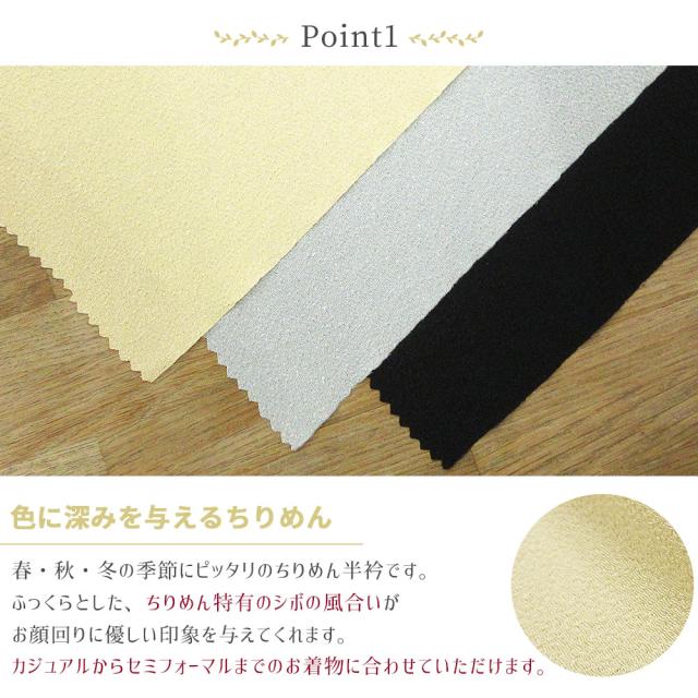 【4枚までメール便送料無料】半衿 無地カラー ちりめん 全3色 日本製 ポリエステル100% お家で洗える 洗濯OK 着物 袷 襦袢 必需品 晴秋冬用 半襟 洒落 カジュアル セミフォーマル 訪問着 色無地 レディース 女性 色半衿