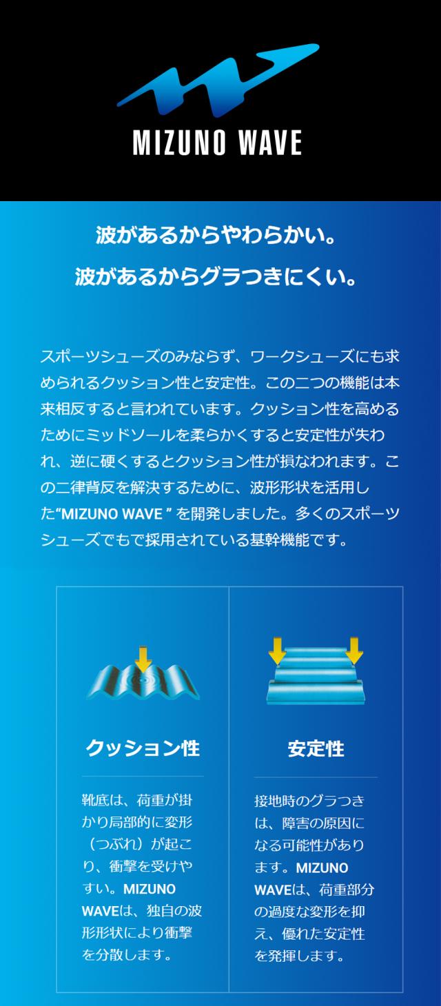 ・MIZUNO「FOAM WAVE」搭載 2層の硬度の異なるフォームを波形形状に重ね合わせたミズノウェーブ構造、ミズノウェーブの特徴であるクッション性と安定性を実現