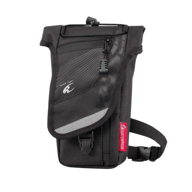 防水仕様のメイン気室と、スマホやカードを取り出しやすいジッパーポケット(非防水)を装備したベルトポーチ。ショルダーベルトも付属し、降車時は肩掛けでも使用可能。