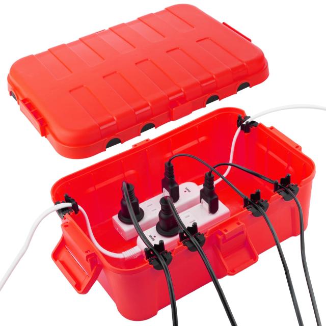 使いやすい:4つのラッチを引いたり押したりするだけで、ボックスを開閉できます。電源を接続し、クランプでコードを留めます。ボックスを壁に取り付けるには、裏側にある2つの鍵穴を使用します。