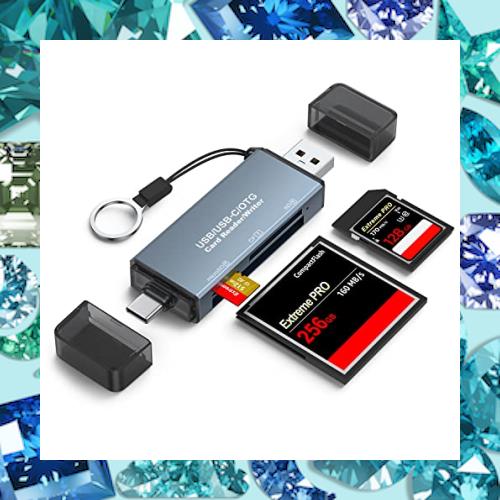 USB3.0端子とUSB-C端子が両方使え、Androidスマホでもタブレットでもパソコンでも対応できて、マイクロSD(TFカード)、SDカード、CF(compact flash)カードの3つのスロットがあり、 一本で多機能コンパクトフラッシュメモリカードリーダーです。