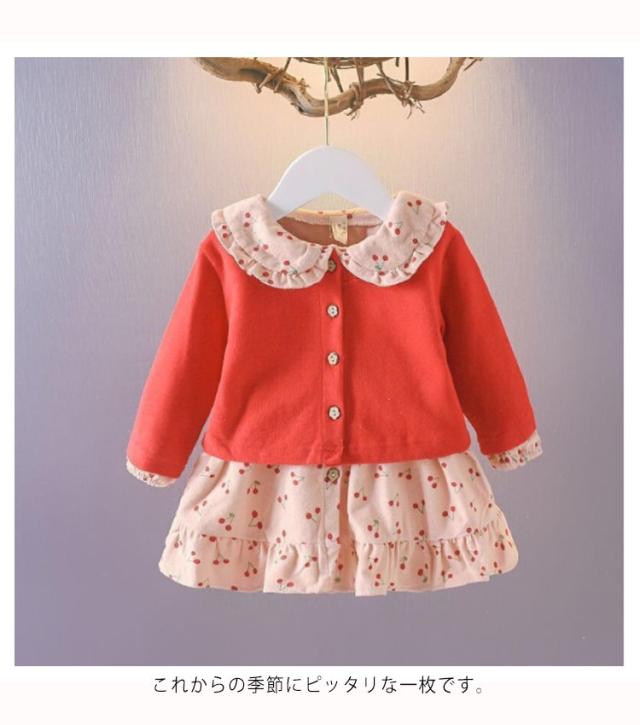 子供服 女の子 長袖 ワンピース ニットカーディガン 2点セット セットアップ 総柄 フリル ワンピース ギャザー 子供 子ども キッズ服 送料無料 おしゃれ かわいい ガーリー 秋 春 通園通学 90 100 110 120 130cm
