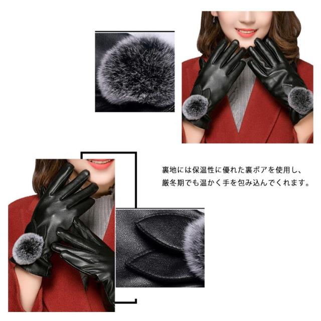 | 高級感をプラスしたデザインは、女の品格を上げてくれます。 防風・撥水性に優れ、冬の通勤・通学、防寒、あったか対策にお使いいただけます。 フェイクレザーですが、柔らかくてしなやかな肌触りです。 裏地には保温性に優れた裏ボアを使用し、厳冬期でも温かく手を包み込んでくれます。 抜群のフィット感で手に馴染み、手首を細く見せる効果も。 スマホ対応しており、手袋したまま操作可能。 | |