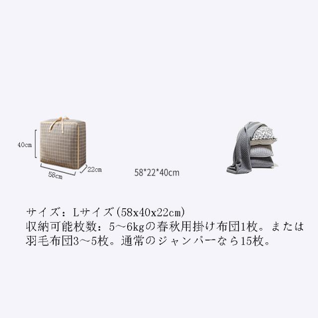 | サイズについての説明 | サイズ:Lサイズ(58x40x22cm) 収納可能枚数:5〜6kgの春秋用掛け布団1枚。または羽毛布団3〜5枚。通常のジャンパーなら15枚。 |