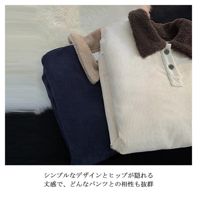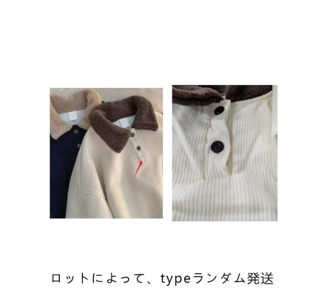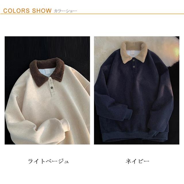 トレーナー 襟付き コーデュロイ ボア襟 スウェット 裏起毛 やや厚手 微起毛 メンズ レディース ゆったり 配色 パーカー ネイビー 紺 ライトベージュ 春 秋冬 ハーフボタン ユニセックス 無地 シンプル