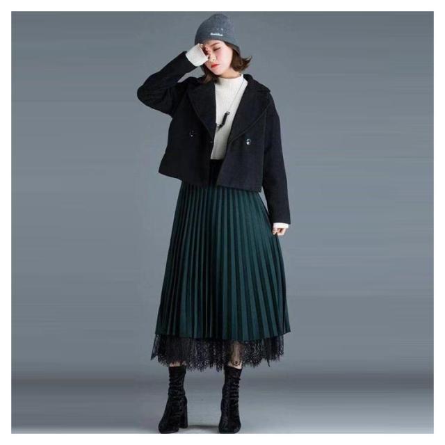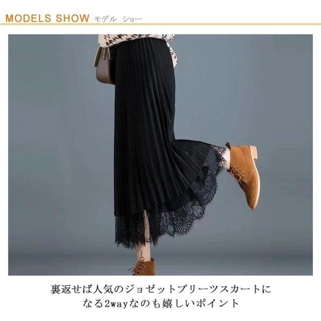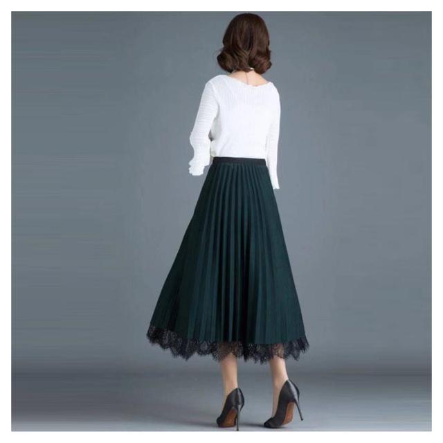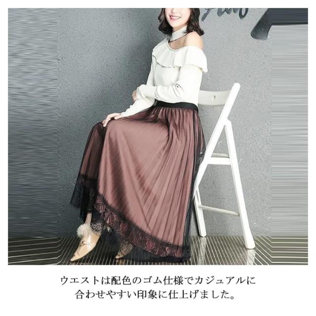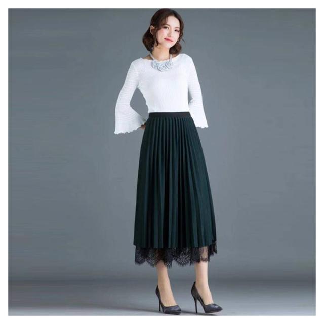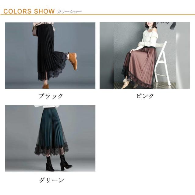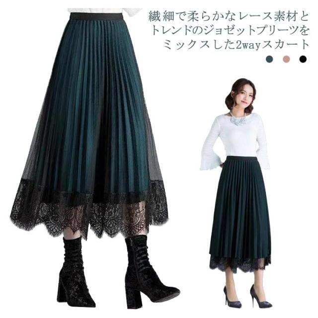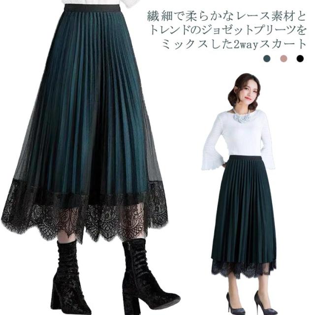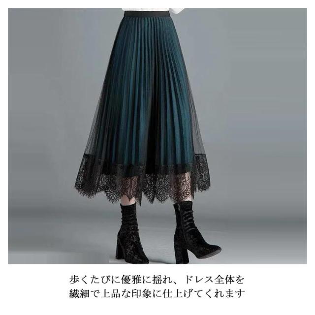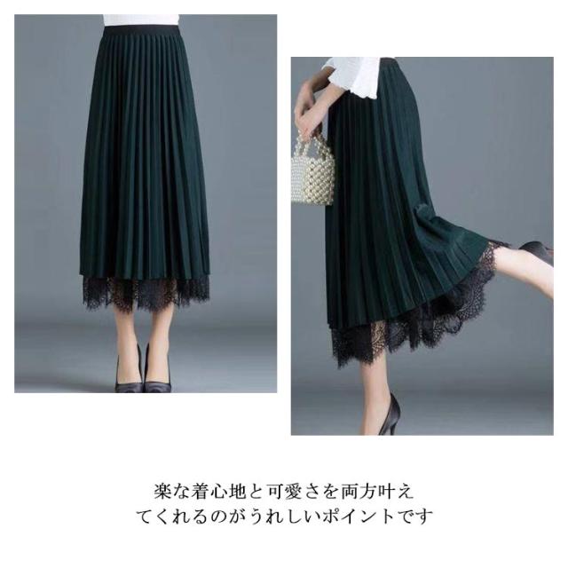 プリーツスカート レーススカート リバーシブル レース 無地 フレア ミモレ丈 スカート レディース Aライン 裏地付き 春 夏 秋 ゴムウエスト 大人可愛い きれいめ 膝下 体型カバー おしゃれ グリーン